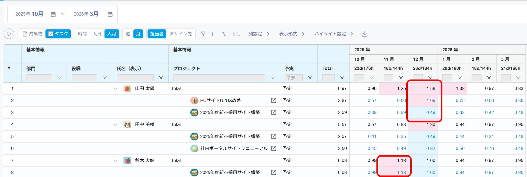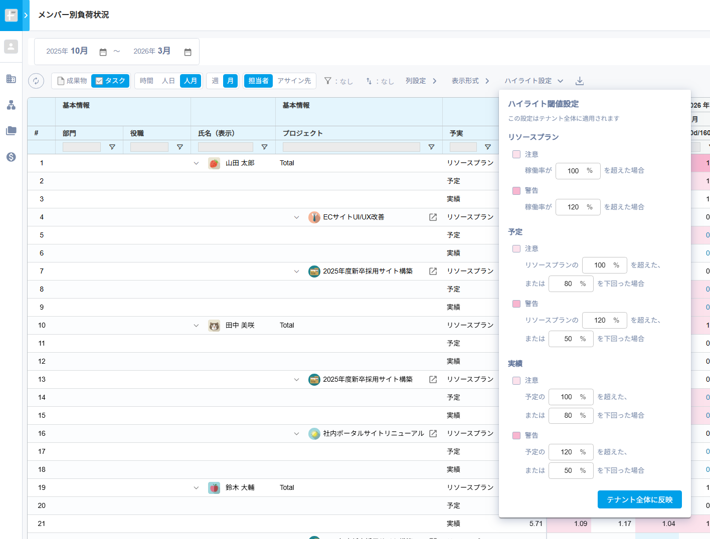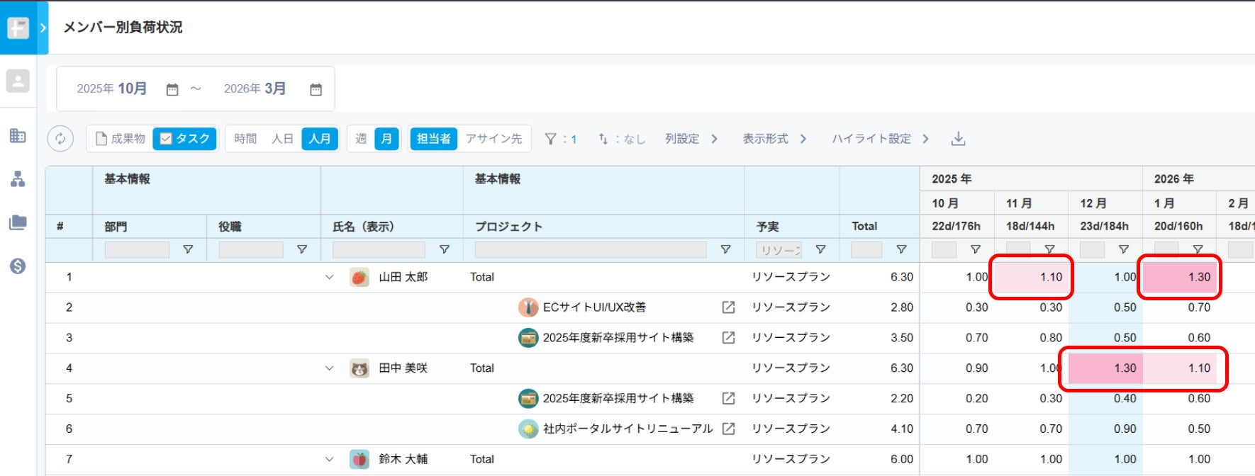 ・計画段階でのリスク予防:リソースプラン段階で、合計が100%を超えるメンバーの早期発見が可能