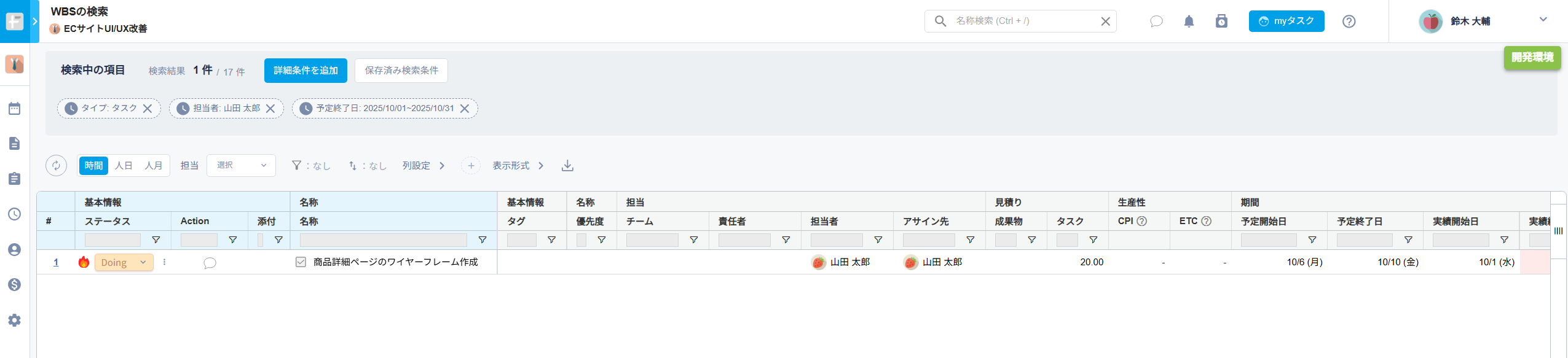・予定・実績工数の明細表示:合計値から予定行と実績行の数値をクリックすると、具体的なタスク一覧の明細へ遷移