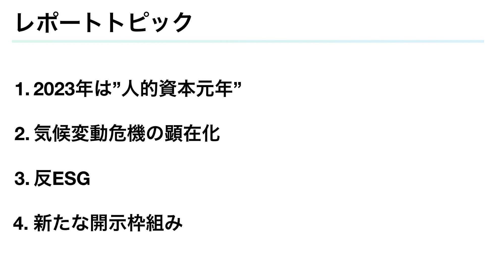 本レポートでは、2023年のESGの動向を環境(E)、社会(S)、ガバナンス(G)の各観点から分析し、世界および日本における法整備、市場動向、新しいフレームワークの発展について調査し、レポートにまとめました。