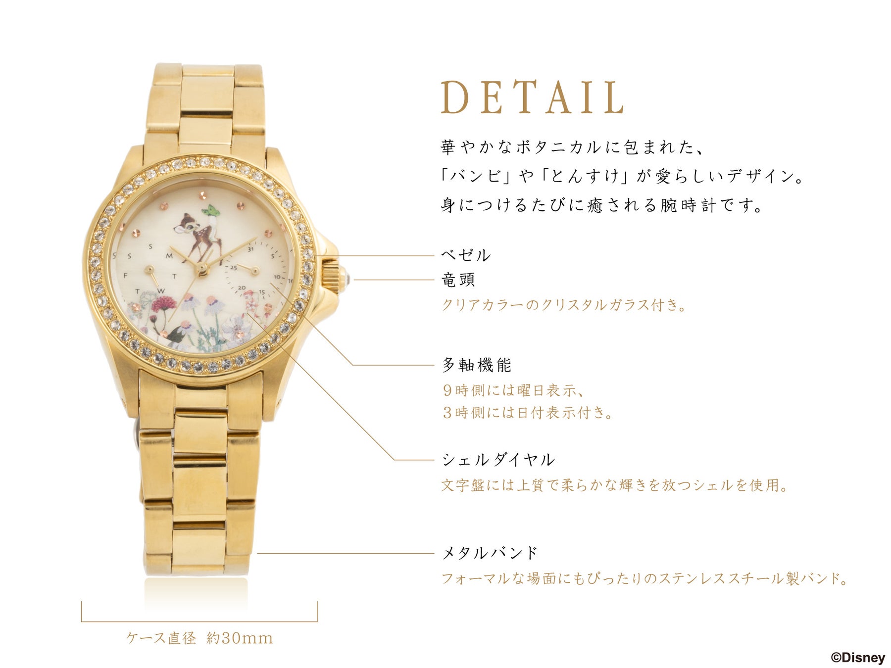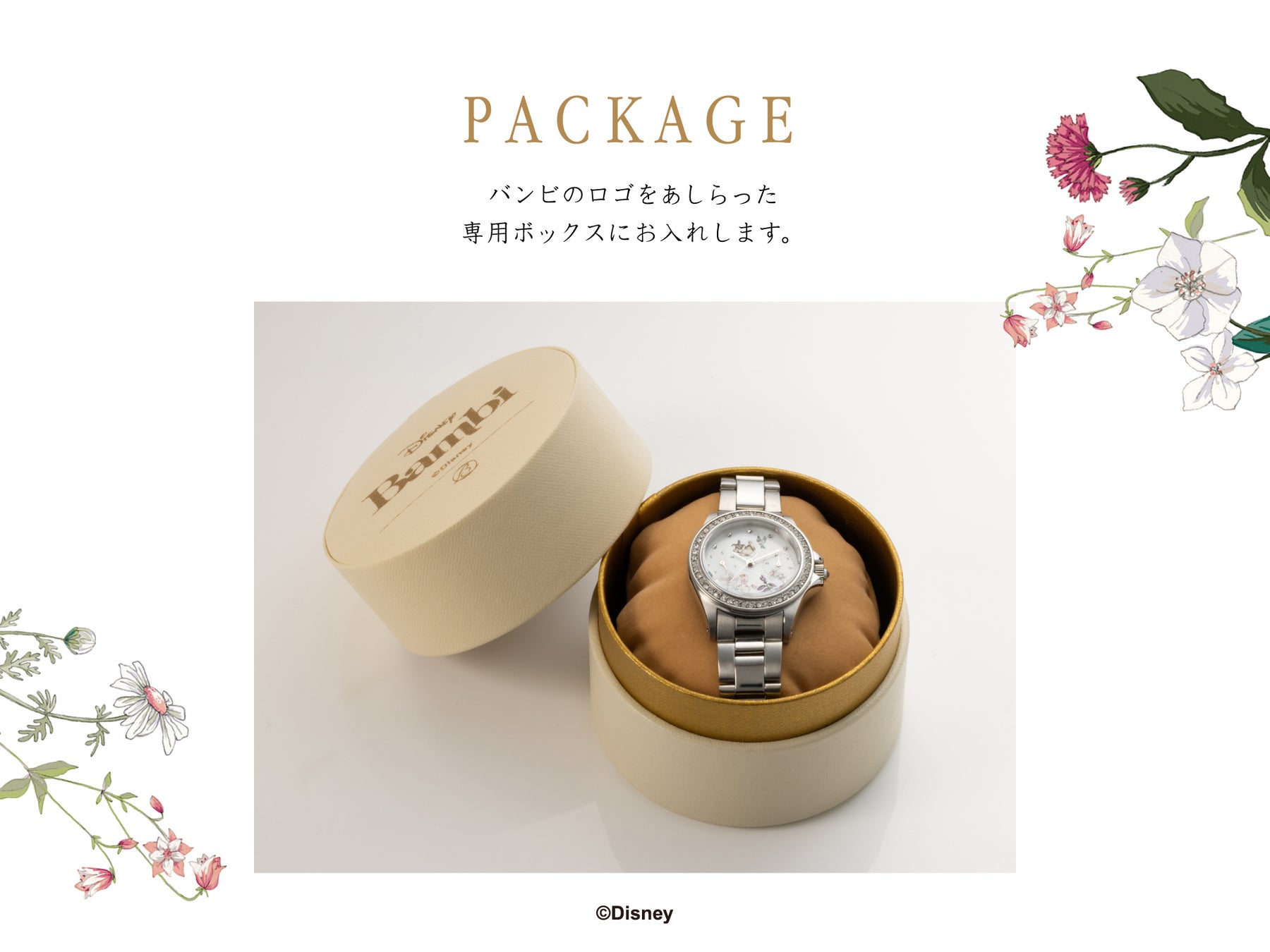 繊細で優しいタッチの草花をあしらった、ボタニカルなバンビの世界。 お花に囲まれた「バンビ」と「とんすけ」がいつまでもあなたのそばに寄り添うデザインウォッチです。