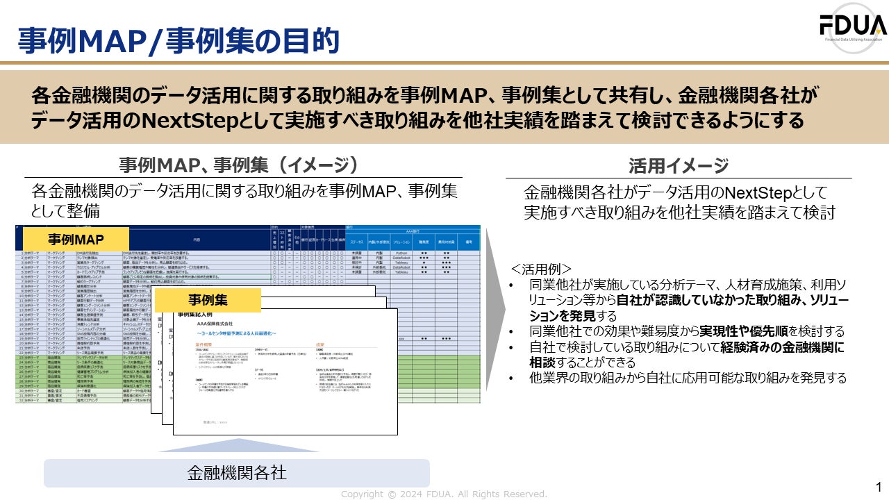 一般社団法人 金融データ活用推進協会(東京都中央区、代表理事:岡田 拓郎、以下「当協会」)は、この度、企画出版委員会による「事例MAP・事例集」活動の一環として、「事例MAP」(第1.0版)の作成が完了したことを発表いたします。本活動は、金融業界のデータ活用の促進を目指し、データ活用事例の共有を通じて金融機関の今後の取り組み検討を支援するものです。