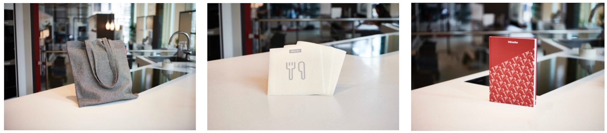 Mieleオリジナル(非売品)のエコバッグ、スポンジワイプ、ノートなどのプレゼントをご用意しています。