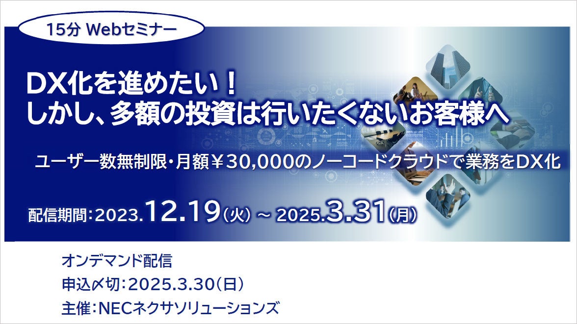 NECネクサソリューションズは、4月までオンデマンド配信していた「【15分Webセミナー】DX化を進めたい!しかし、多額の投資は行いたくないお客様へ」を、好評につき視聴期間を2025年3月31日(月)まで延長します。