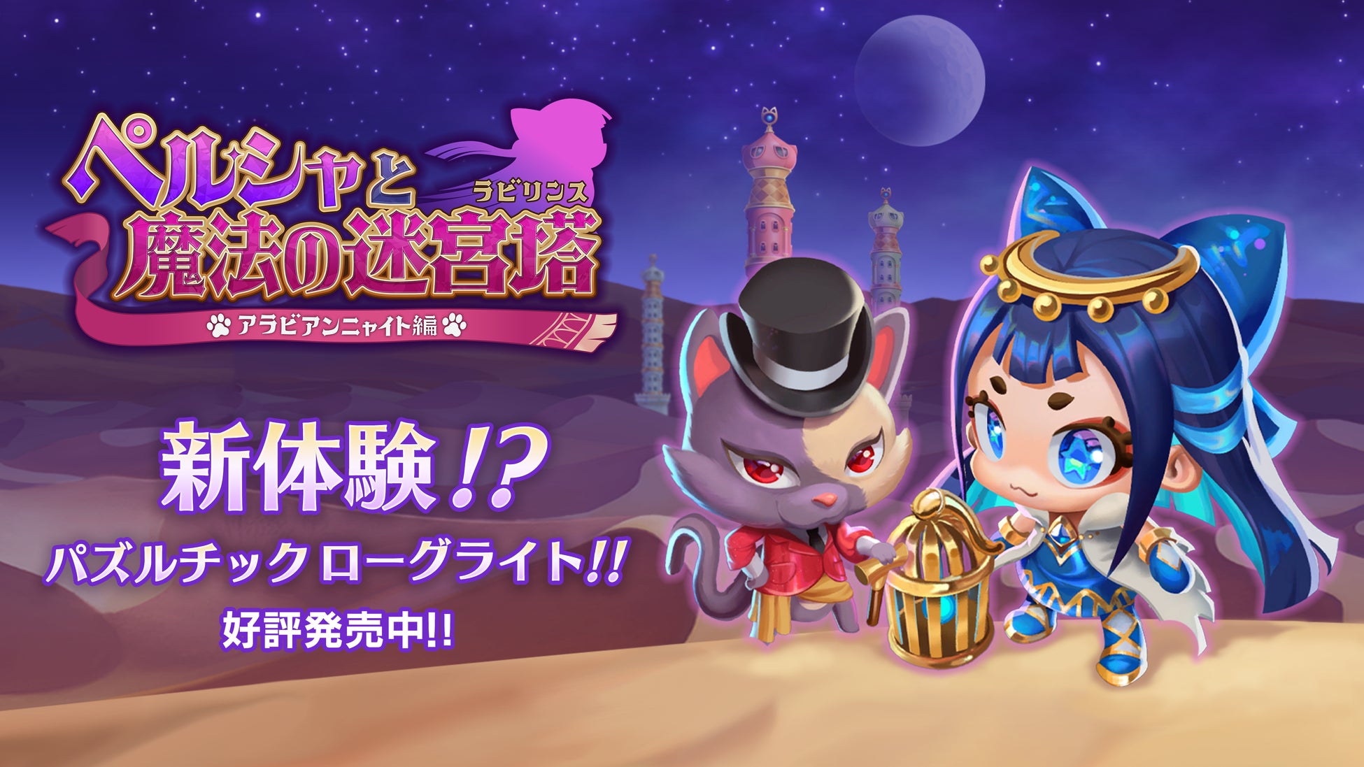 「ペルシャと魔法の迷宮塔」は、3マッチパズルとダンジョンRPGを融合させた新感覚のパズルRPGです。主⼈公の少⼥「ペルシャ」を操作して塔の謎を解き、宿敵「ロック」を捕まえよう!