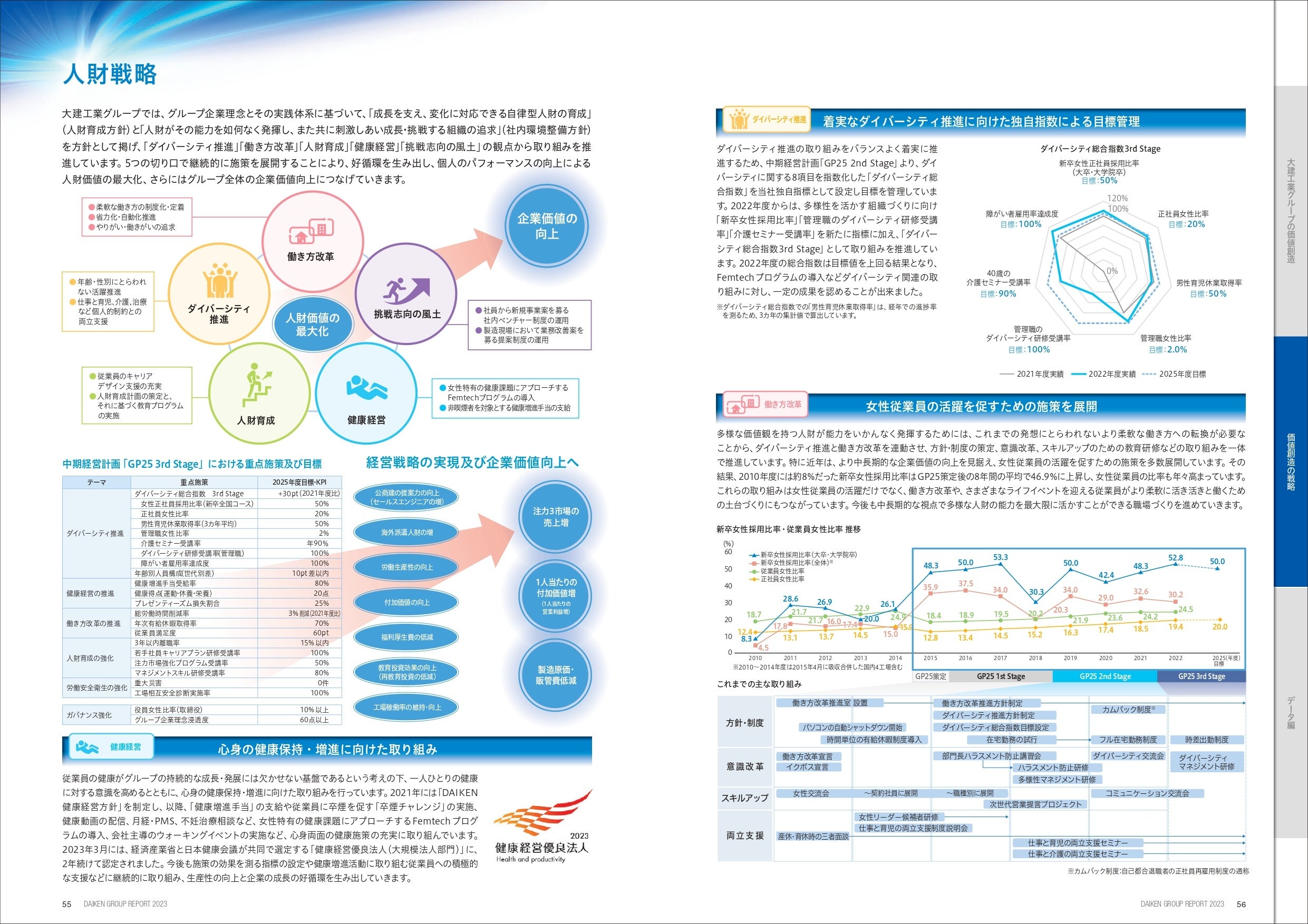 DAIKENグループレポート2023「表紙」と「人財戦略」ページ