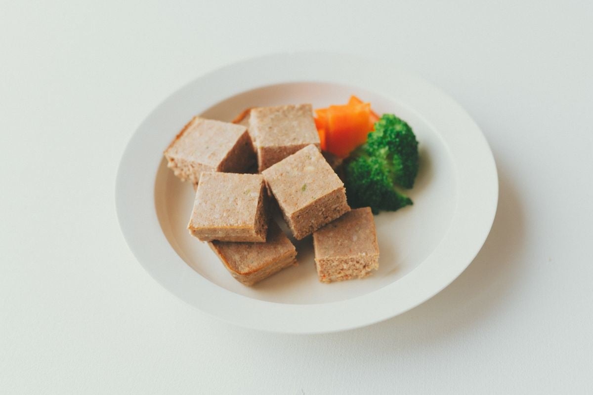 天然メバチマグロと、吟味した素材とで作った無添加ごちそうフィッシュローフ。柔らかく、小型犬や老犬も食べやすい食感に仕上げています。主原料は天然メバチマグロが60%。亜鉛と鉄分を多く含む血合も使用しています。さらに、おからやオートミール、野菜、卵入り。着色料や保存料は使用せず、無添加で仕上げています。