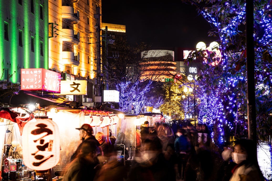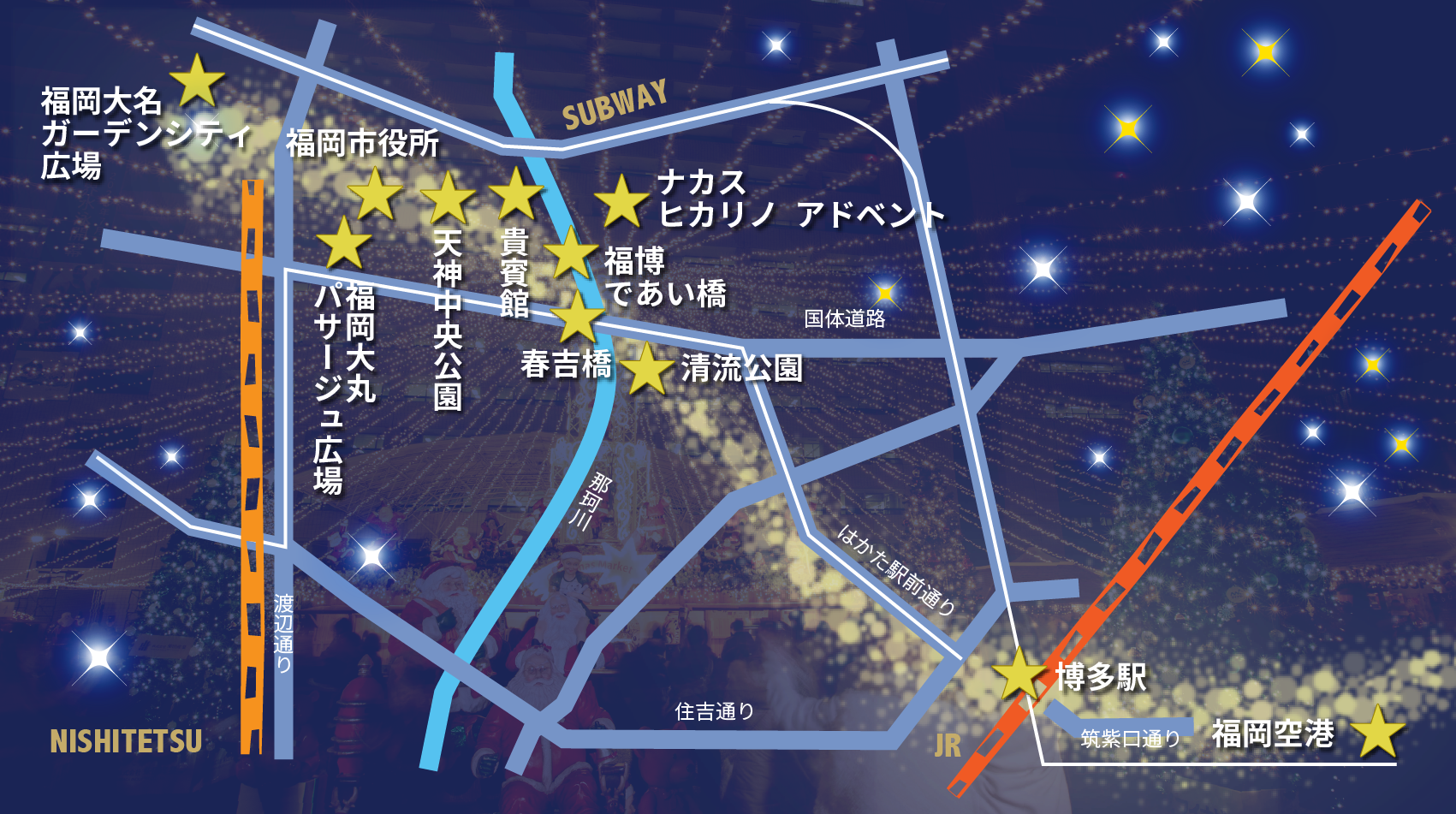 2020年より開催されている「ナカスキボウノヒカリ」は「ナカス ヒカリノ アドベント」(企画・運営:株式会社Mr.Weihnachtsmann、福岡市中央区清川、総合プロデューサー 佐伯岳大)と改称し、4年目となる2023年は中洲中央通り、那珂川通り、明治通り、福博であい橋の中洲地区を、きらびやかなイルミネーションで照らします。清流公園の屋台が並ぶ川沿いまでライトアップが続き、橋の上からの景色は見ものです。2023年11月6日(月)から始まる博多、16日(木)から天神中央公園、そして17日(金)からは天神の各会場とつながります。