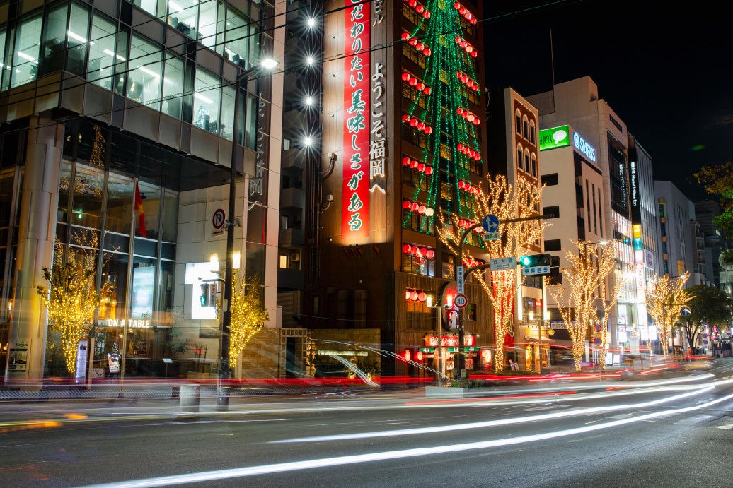 中洲大通りには、キラキラと点滅する1万球を超えるイルミネーションをまとったツリーが登場