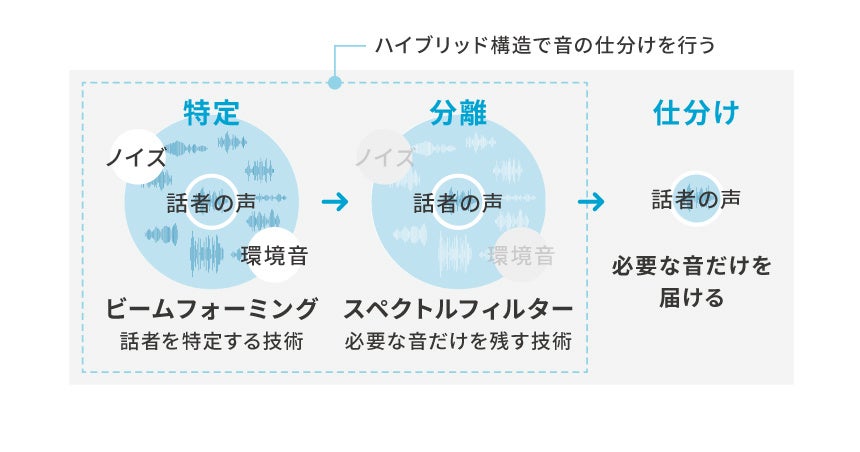 「Magic Focus Voice」(旧:インテリジェントマイク)は、音が2つのマイクに到達する時間差を利用して音響空間を認識し、話者を特定する「ビームフォーミング」、音声を抽出して騒音を除去する「スペクトルフィルター」の2つの技術をハイブリッド処理しています。雑音に紛れ込んだ音声の推定が難しいスペクトルフィルターには、長年の研究から声の特性を熟知しているNTTのノウハウを凝縮。音質を損なわずに人の耳に合わせるチューニングを実現しました。自然な「あなたの声」だけを取り出して相手に届けます。