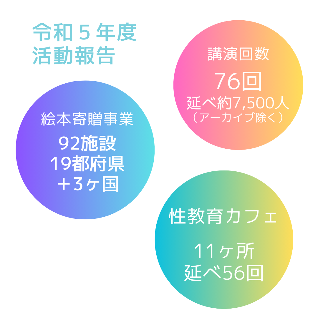 代表の著書である絵本「げっけいのはなし いのちのはなし」を通して、小さい頃からの性教育の大切さや生き方の多様性などを広く知ってもらう活動を展開しています。