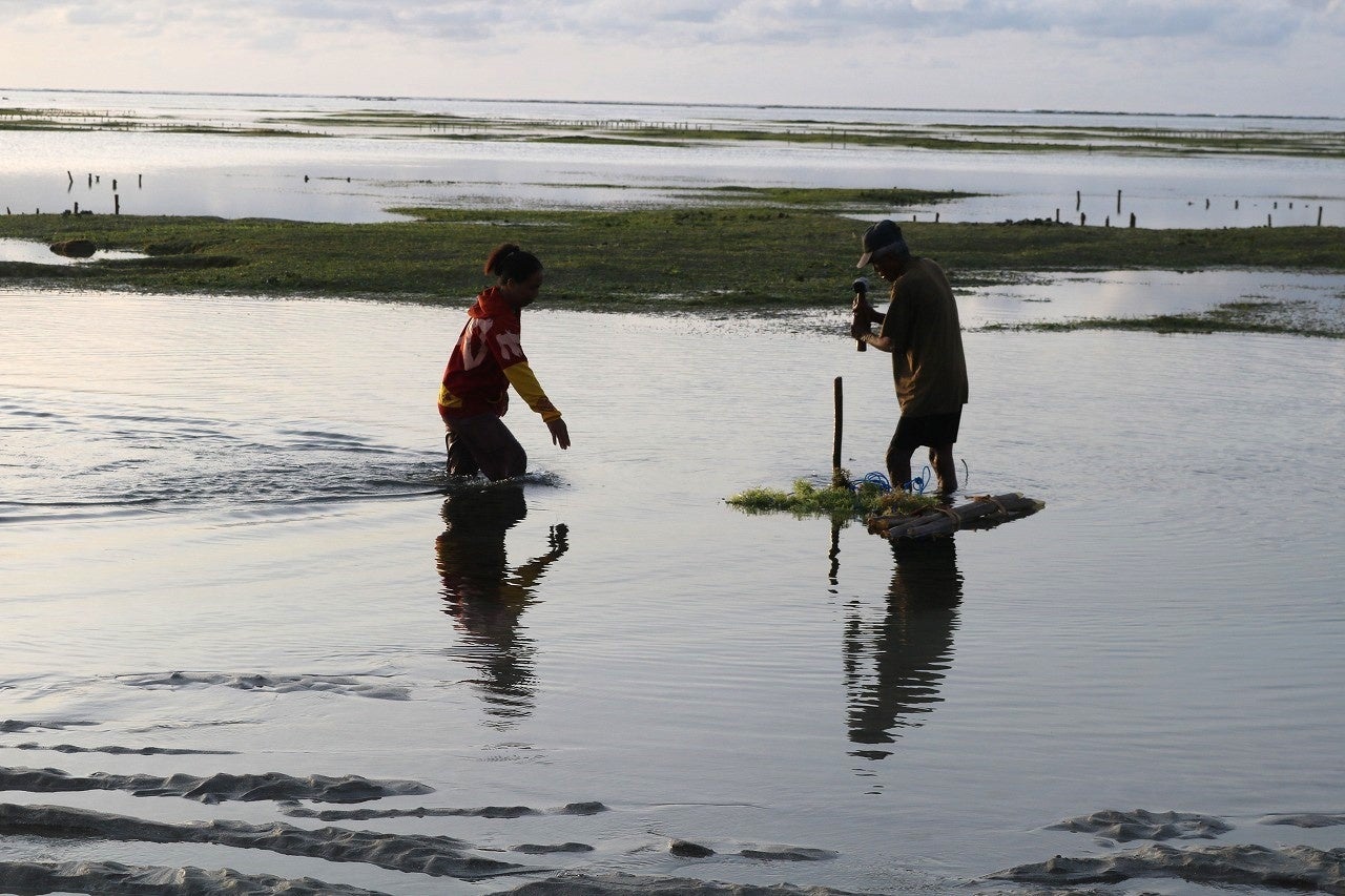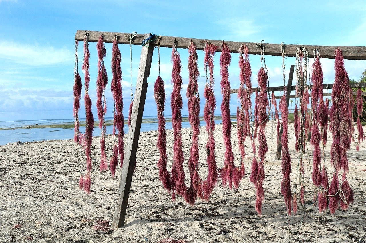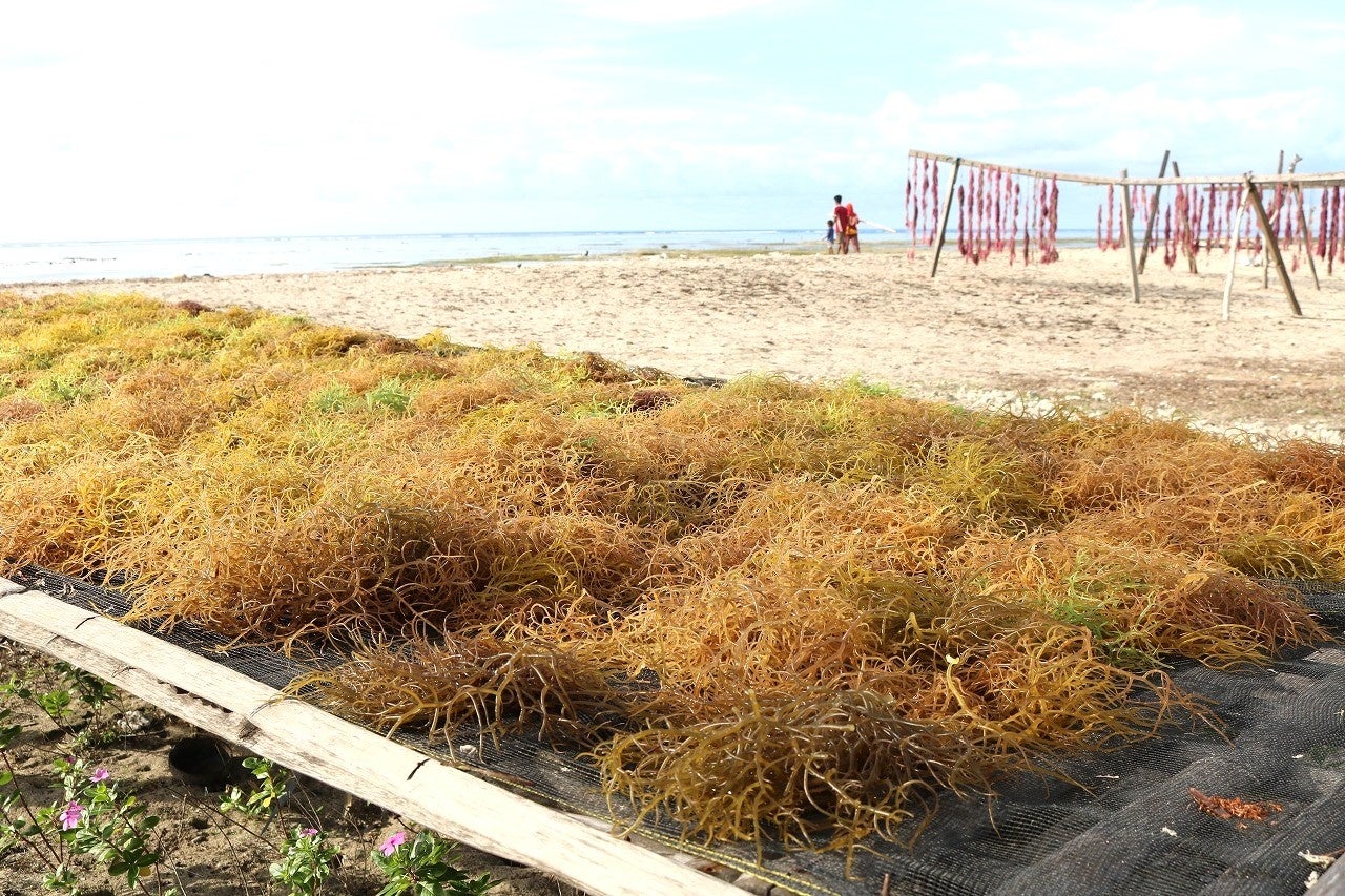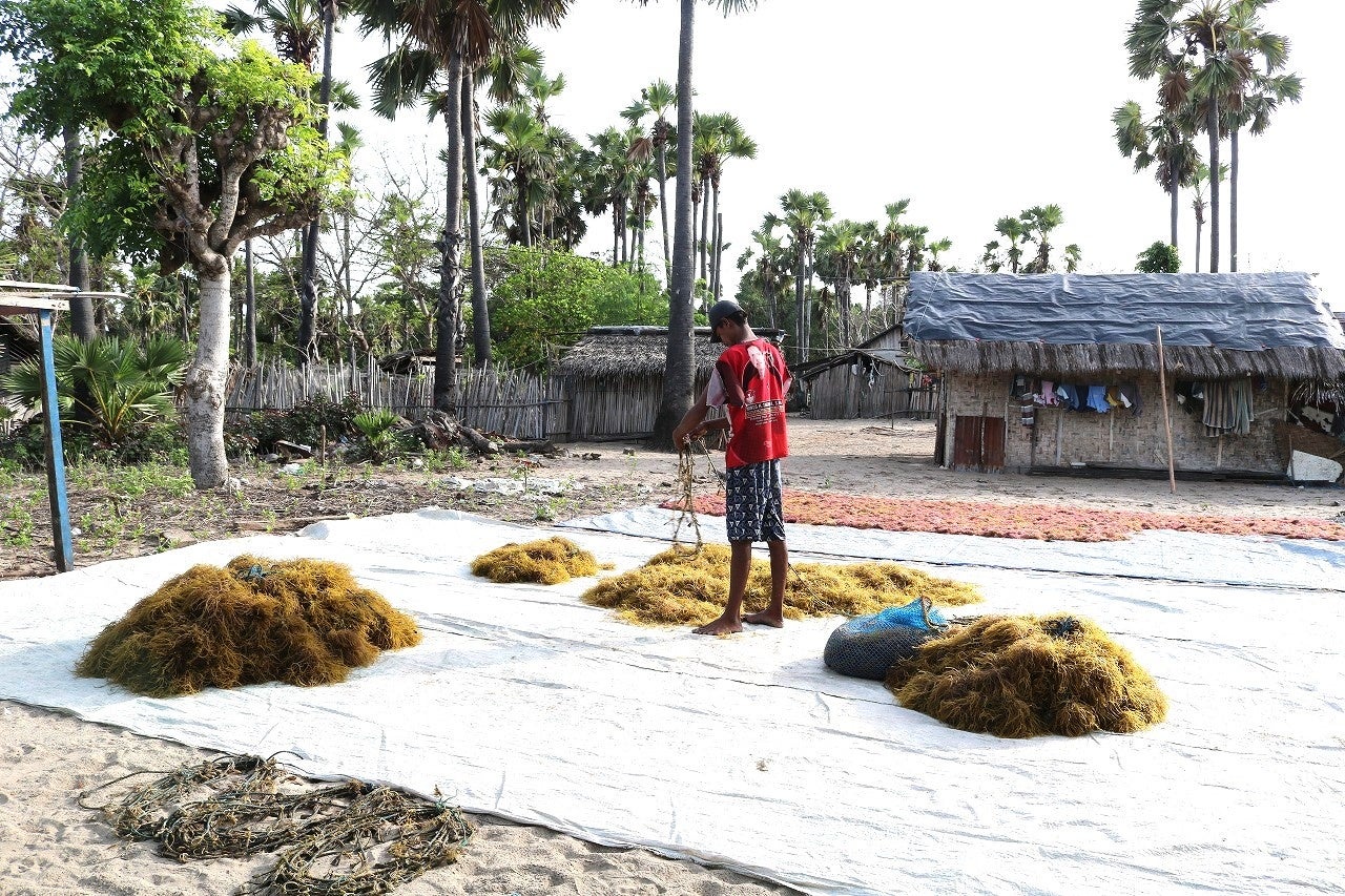 島の海岸では早朝から海藻栽培に従事する村人たちが働いています。海藻から砂を取り除いたり、大きく育った海藻を運んで天日干しにしたり。毎日海藻を育てて暮らしていますが、自分たちが育てる海藻がその後どう使われているのかは知りません。海藻の種の着いたロープを業者から一本150,000ルピア(約1,500円弱)で購入し、乾燥したあとの海藻を1キロ当たり6,500ルピア(約65円弱)で業者に売り渡します。一本のロープからは何回か収穫できます。