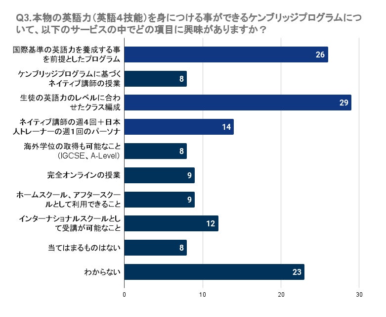 Q3で「本物の英語力(英語4技能)を身につける事ができるケンブリッジプログラムについて、以下のサービスの中でどの項目に興味がありますか?(複数回答可)」と質問したところ、島根県で最も多かったのは「生徒の英語力のレベルに合わせたクラス編成」で29名でした。次いで、「国際基準の英語力を養成する事を前提としたプログラム」には26名、「ネイティブ講師の週4回+日本人トレーナーの週1回のパーソナルトレーニング」には14名が興味を持っています。一方で、「ケンブリッジプログラムに基づくネイティブ講師の授業」や「海外学位の取得も可能なこと(IGCSE、A-Level)」に関心を持つ人はやや少なめで、8名の回答でした。これらの結果から、多くの人は実用的な英語力の養成や個別のニーズに応じた指導に重きを置いていることが伺えます。
