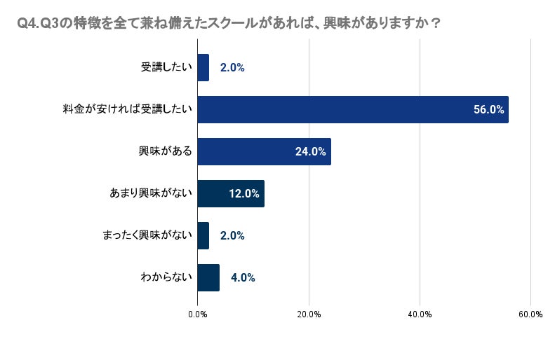 Q4で「Q3の特徴を全て兼ね備えたスクールがあれば、興味がありますか?」と質問したところ、島根県では2.0%が受講を希望し、56.0%は料金が手頃であれば受講したいと考えています。さらに、24.0%は興味を示していると回答しました。多くの人がこのような特徴を持つスクールに一定の興味を示していることが分かります。