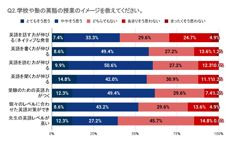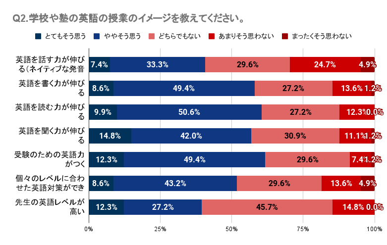Q1・Q2では、子どもが英会話スクールや英語塾に通っていたが英語力アップの効果を感じていない人が一定数いること、学校や塾の英語の授業に対して明確な効果や良い印象を持てていない人が多いことが明らかになりました。