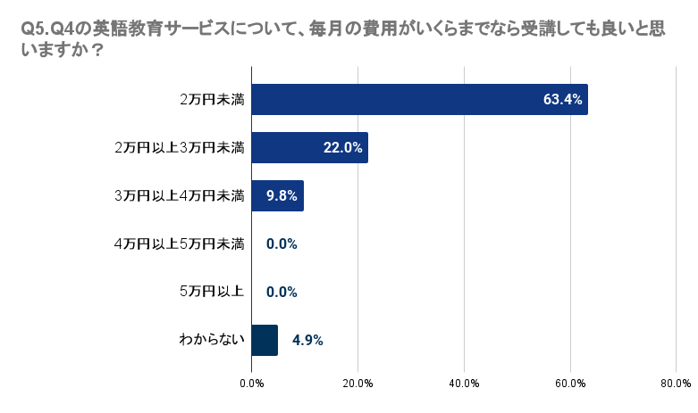 Q4で「受講したい」「料金が安ければ受講したい」「興味がある」と回答した人に、Q5で、「Q4の英語教育サービスについて、毎月の費用がいくらまでなら受講しても良いと思いますか?」と質問したところ、最も多い63.4%の回答者は2万円未満が適切と感じています。22.0%は2万円以上3万円未満、9.8%は3万円以上4万円未満と答えました。対照的に、4万円以上の費用を考える回答者は極少数で、4万円以上5万円未満と5万円以上が0.0%でした。これにより、島根県では多くの人が3万円未満の価格帯を望んでいることが明らかとなりました。