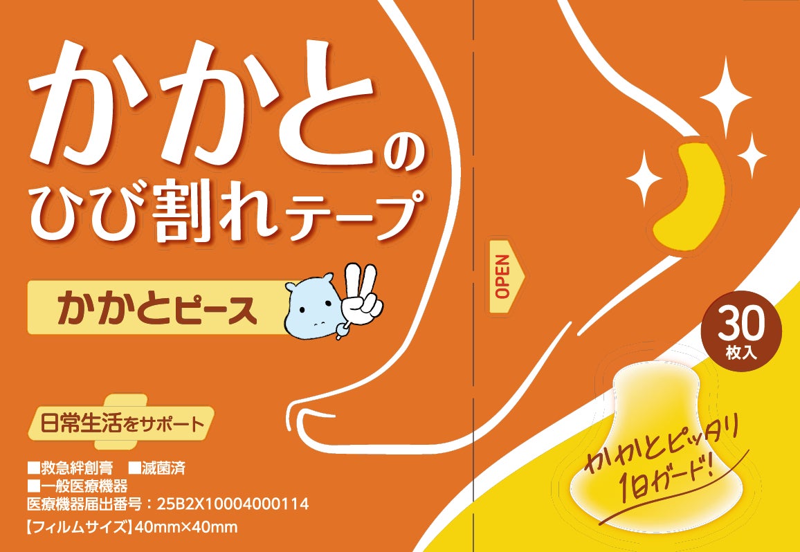 「かかとピース」は、乾燥でひび割れたかかとを保護するための専用絆創膏です。適度な伸縮性を持つテープがかかとのカーブに自然にフィットし、ひび割れの裂けを効果的にカバーします。目立ちにくい透明な素材を使用し、靴下や床に貼りつきにくい粘着剤を選定しているため、動きやすさと使いやすさを両立しています。おやすみ前の保湿ケアに加えて、朝出かける際に「かかとピース」を貼ることで、日中の痛いひび割れを保護しながら快適な一日をサポートします。