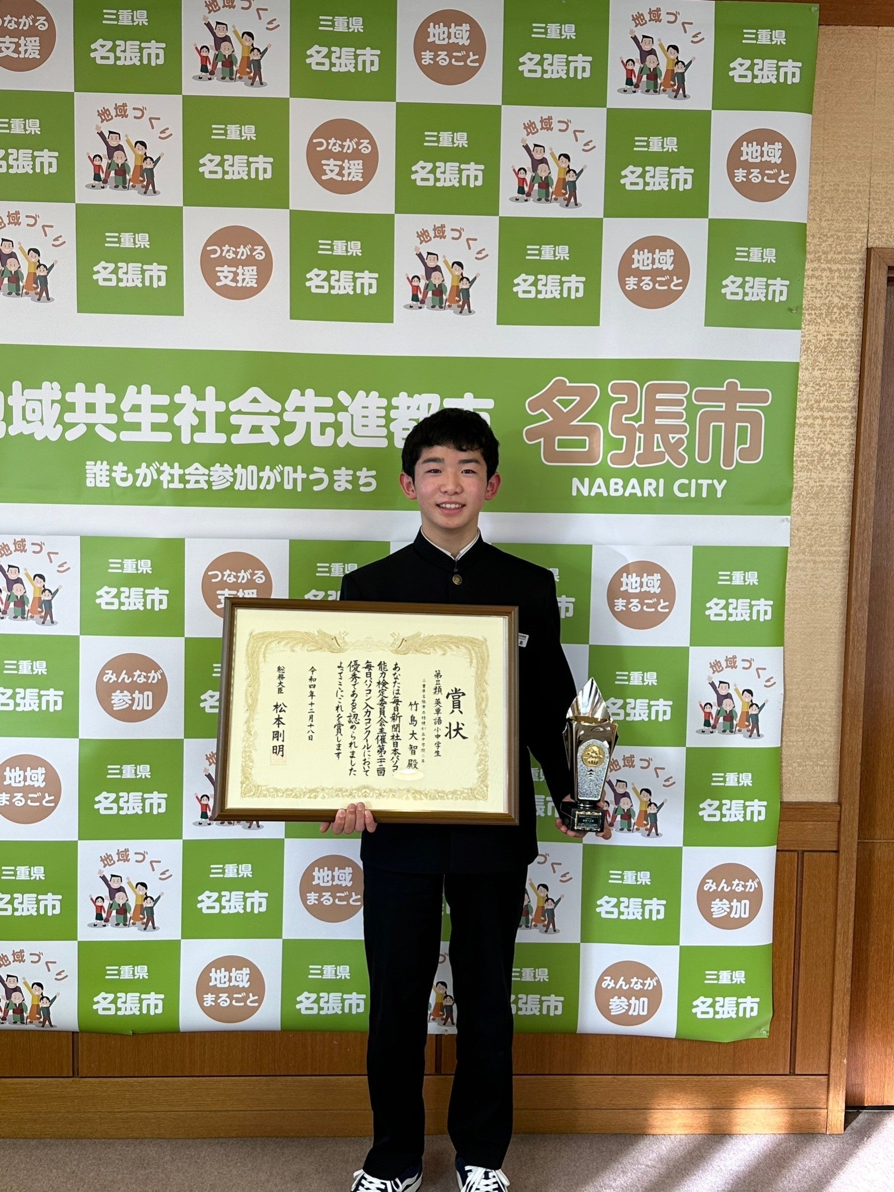 アクティメソッド生の竹島大智くん(中2)が第22回毎日パソコン入力コンクール全国大会 英単語 小・中学生の部にで優勝したことを名張市長を表敬訪問し、結果報告を行いました。