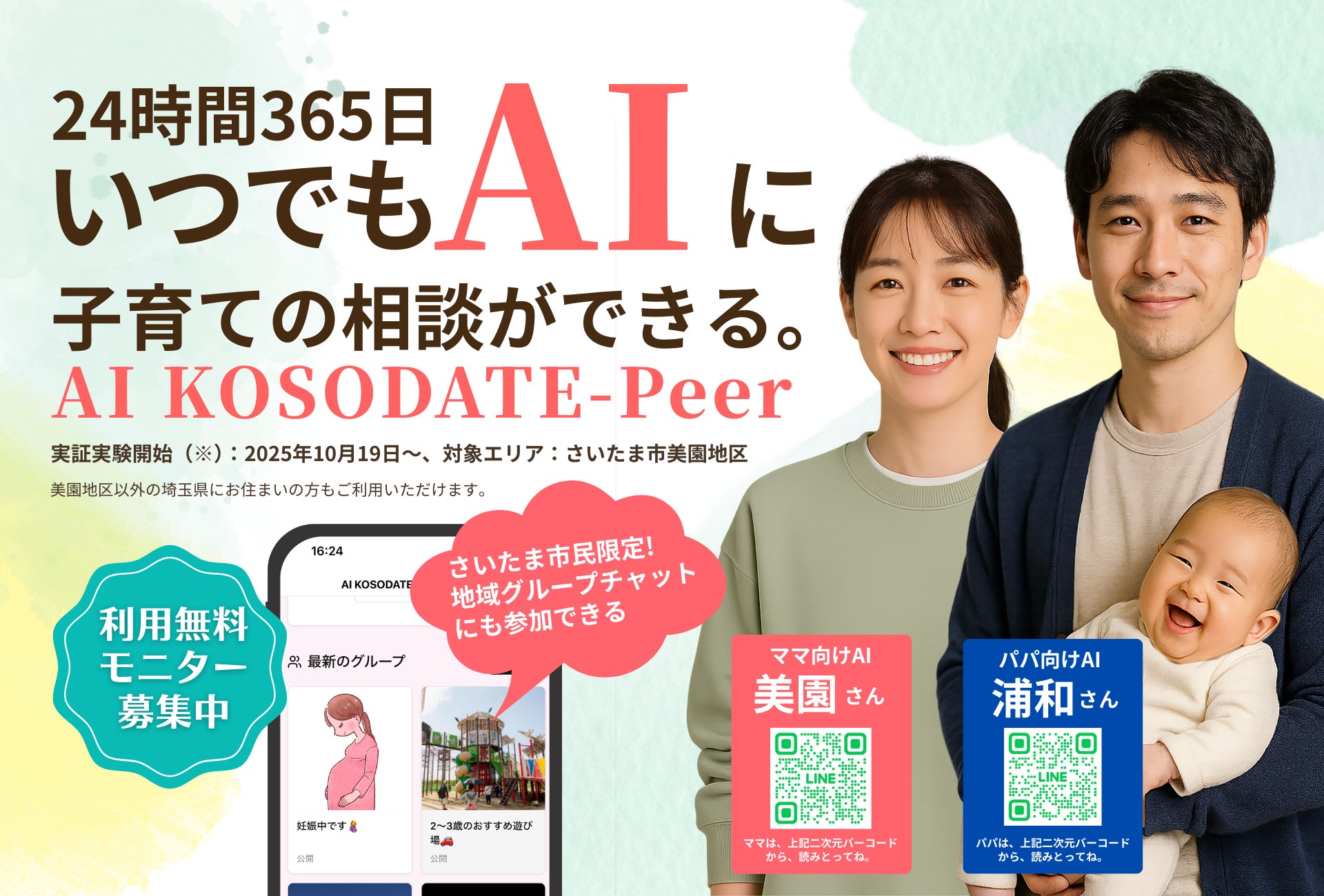 2025年7月17日、トモイク株式会社の「AI KOSODATE-Peer」が、さいたま市の「スマートシティさいたまモデル」構築事業費補助金の支援対象事業として採択されました。また当社は10月より、さいたま市浦和美園地区およびさいたま市内において、地域内での頼れる育児のつながりを創るべく、本サービスの実証的な運用を始めています。
