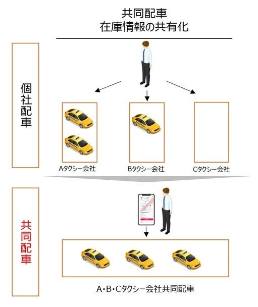 共同配車による各社のタクシー在庫情報の共有化で利用者の配車手配の手間を減らすとともに、待ち時間の減少を期待できます。また、配車アプリにすることで配車指示は自動で直接ドライバーに通知されるため車両の運用効率の向上を期待できます。