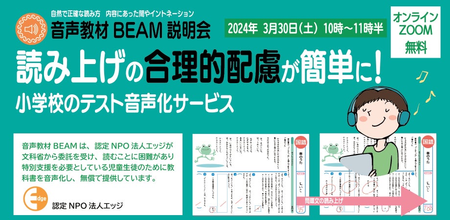 3月30日開催「読み上げの合理的配慮を、簡単に!~小学校のテスト音声化サービス~」にて、小学校のテスト音声化サービスの開発エピソードから実際のサービス紹介を光文書院より、読みの困難さのある児童に向けた音声教材BEAMの活用紹介を認定NPO法人エッジよりいたします。