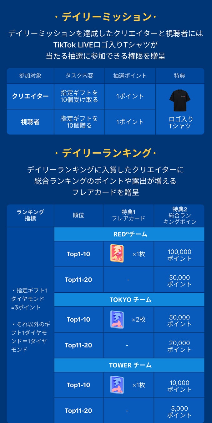 本イベントでは視聴者・配信者向けにデイリーミッション、配信者向けデイリー・総合ランキングが同時開催されます。以下のポイントを合算の上、各グループの総合ランキング上位10名の配信者は『TikTok LIVE | RED° TOKYO TOWER』アンバサダーの最終選考へ進出できる権利を贈呈いたします。