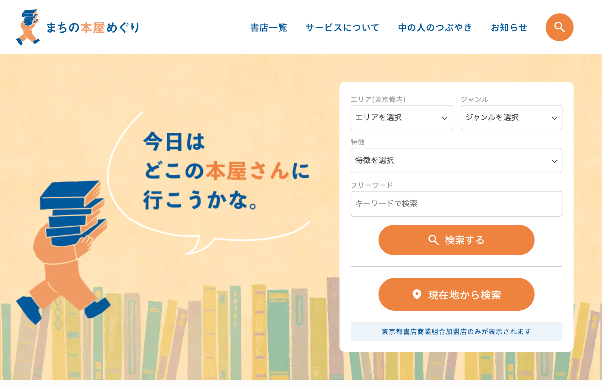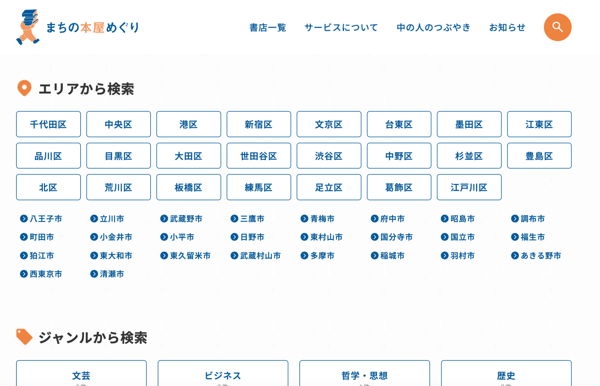 エリアから探す、ジャンルで探すなど、目的に合わせて“まちの本屋”を検索できます。