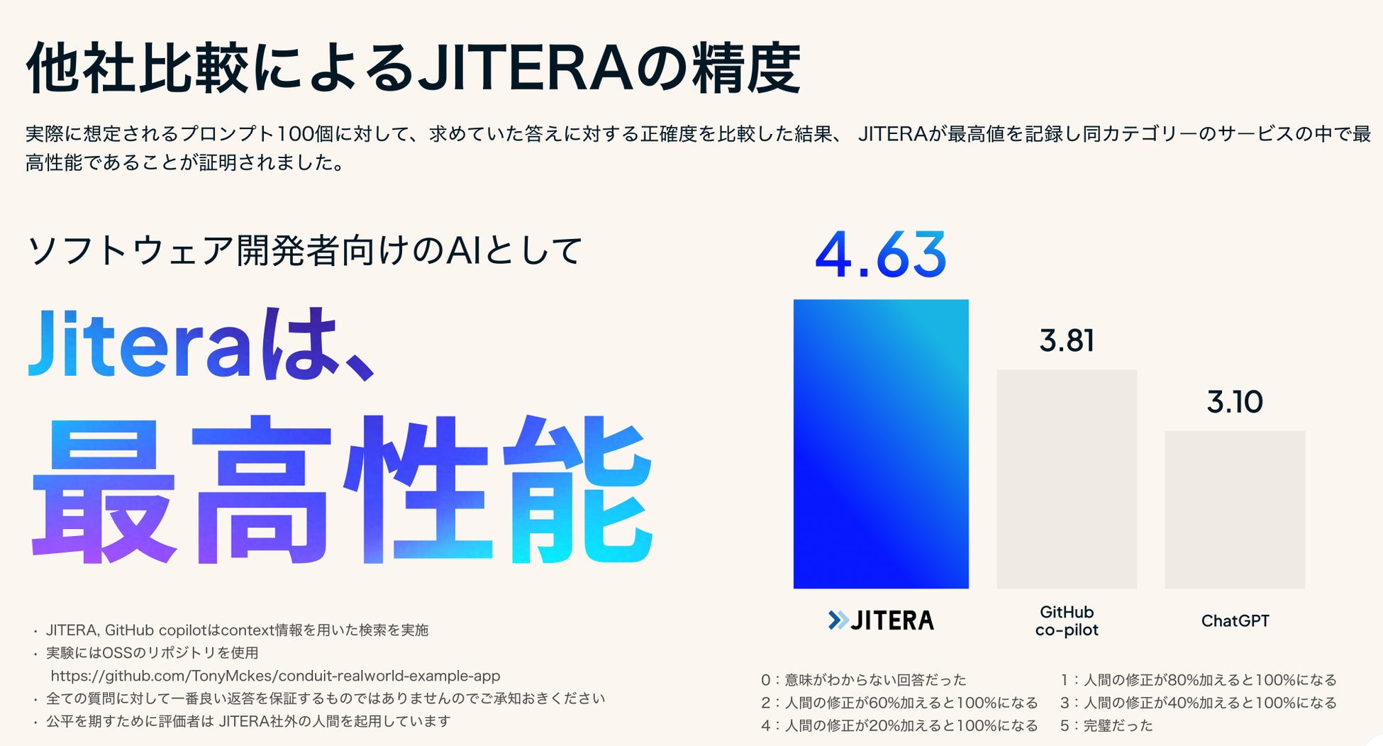 実際に想定されるプロンプト100個に対して、求めていた答えに対する正確度を比較した結果、Jiteraが最高値を記録し、同カテゴリーのサービスの中で最高性能であることが証明されました。