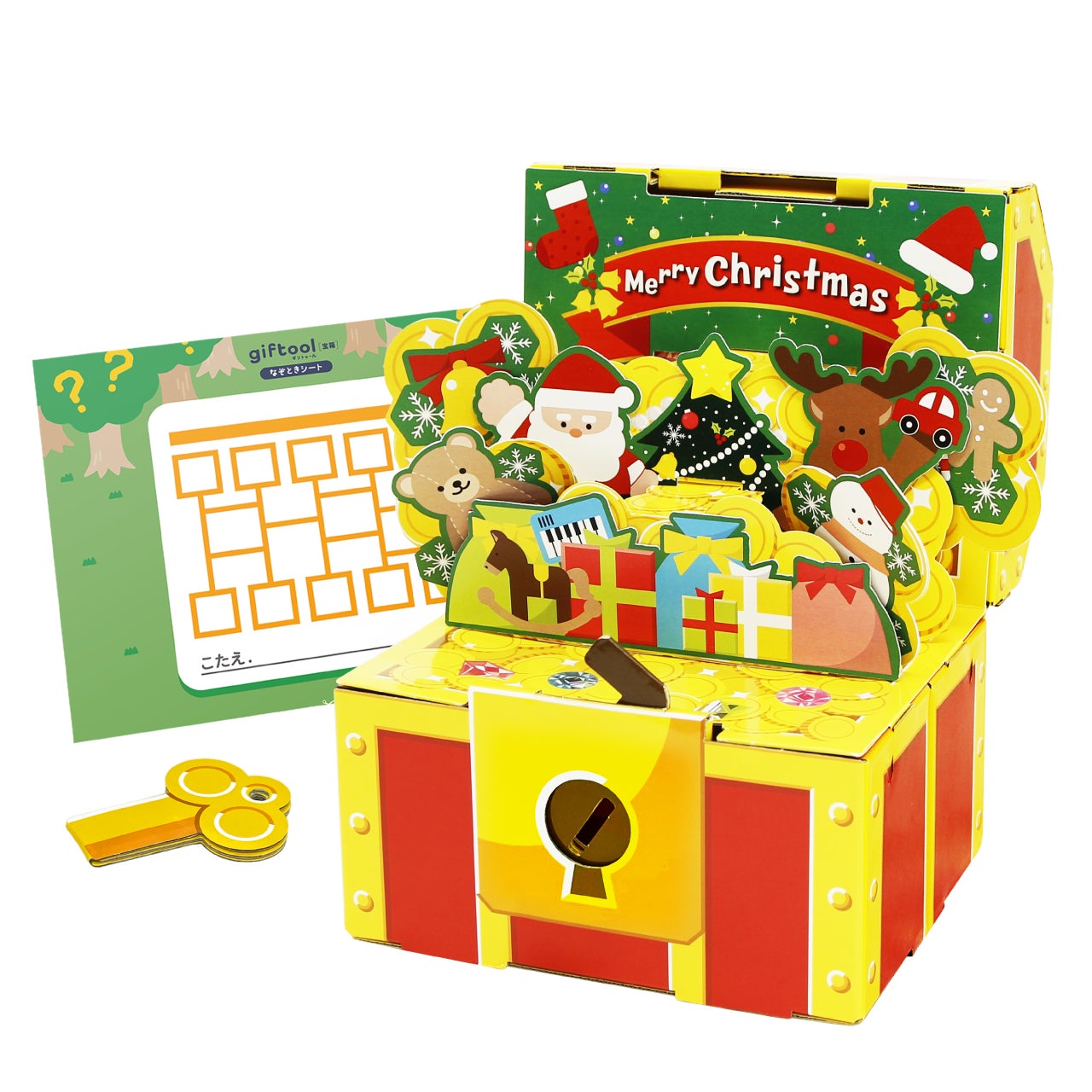 giftool【宝箱】金ピカサンタは子どもも大人も楽しみな年末の一大イベント”クリスマス”をさらに楽しむための宝箱型のギフトボックスで、箱を開けるとサンタやトナカイたちが飛び出してクリスマスを祝う仕様になっています。またベーシックのgiftool【宝箱】金銀財宝と同様に鍵付きですので、宝箱に鍵をかけてさまざまな遊び方ができます。鍵や宝箱を隠して宝探しゲームをしたり、クイズに正解すると鍵がもらえるゲームをしたり、クリスマスをみんなで盛り上がるのにぴったりのさまざまな遊びを楽しめます。