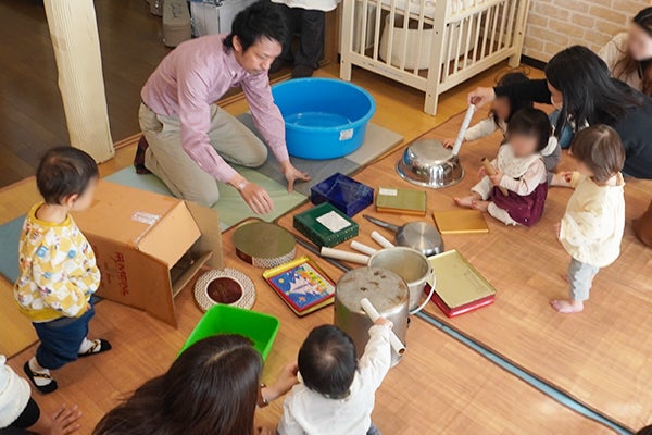 保護者の皆さんも一緒に叩いたり、歌ったり、お子さまたちに負けないくらいの笑顔で楽しんでいただけている様子でした。