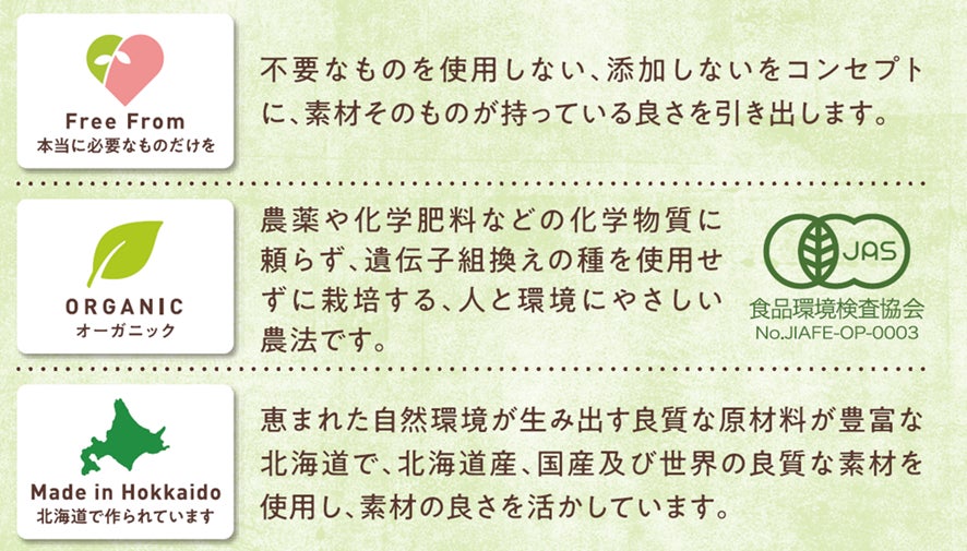 自然の素材が持っている味、 栄養、 良さを活かした食品づくりを目指します。 オーガニック、 北海道産、 国産または世界の良質な素材を使用し、 シンプルな製法で、 最低限の加工をし 素材の持つ良さを引き出した製品をお届けします。
