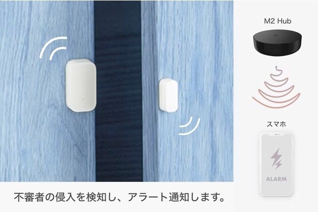 「Aqara振動センサー」「Aqaraドア窓センサー」と連動させれば、窓の異常を感知し、スマホへ通知します。
