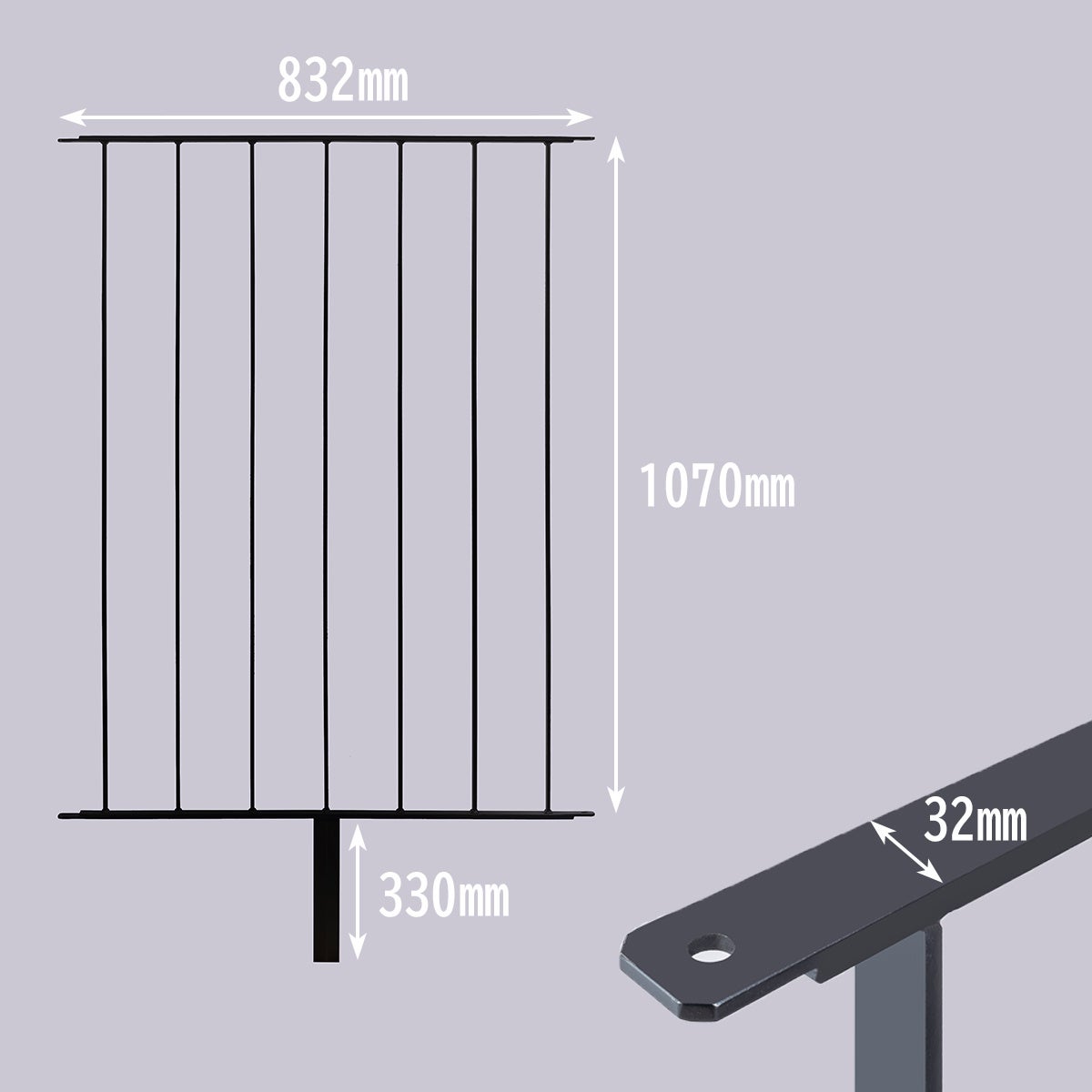 フェンス本体W832㎜×H1070㎜、フェンス端2個セットW66㎜×H1070㎜を連結し設置します。