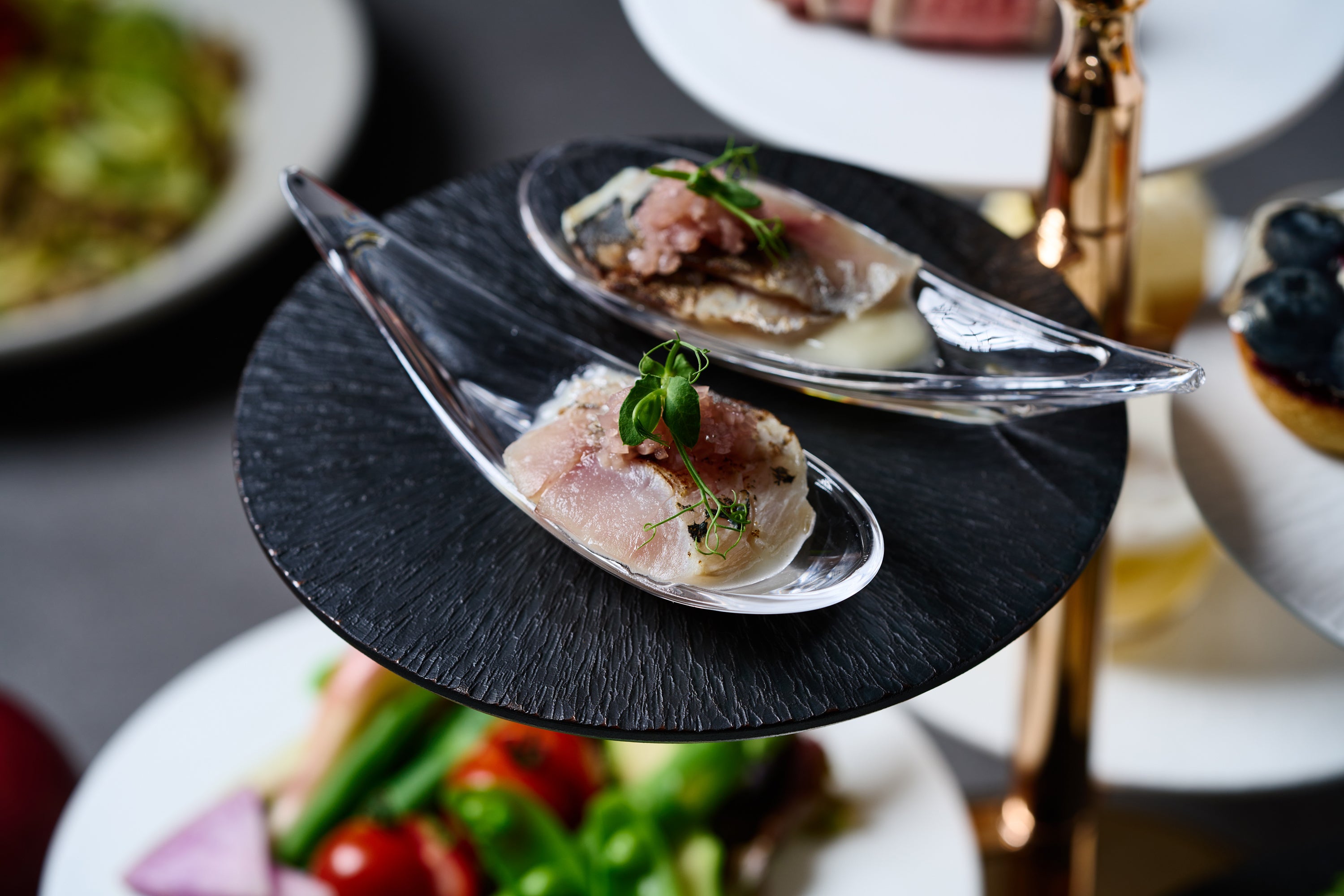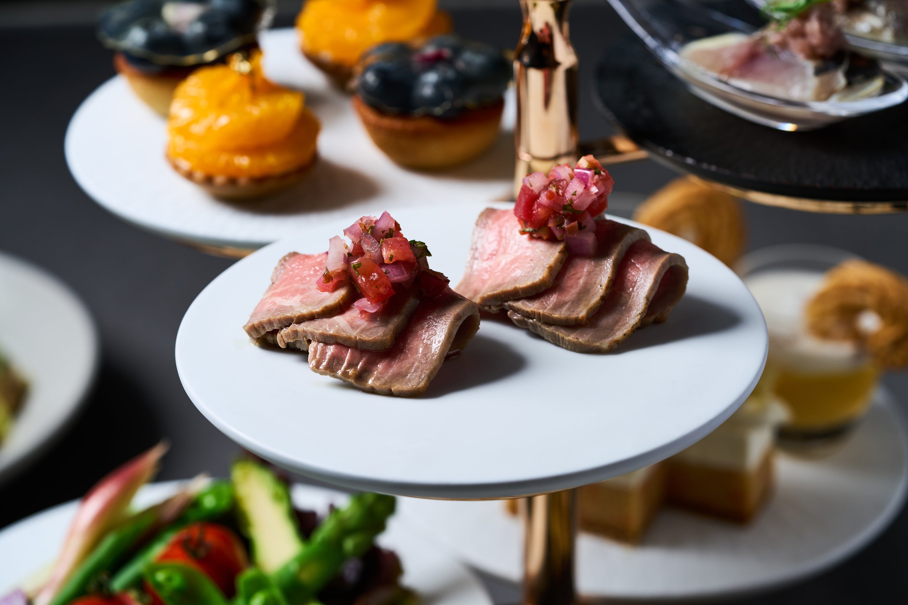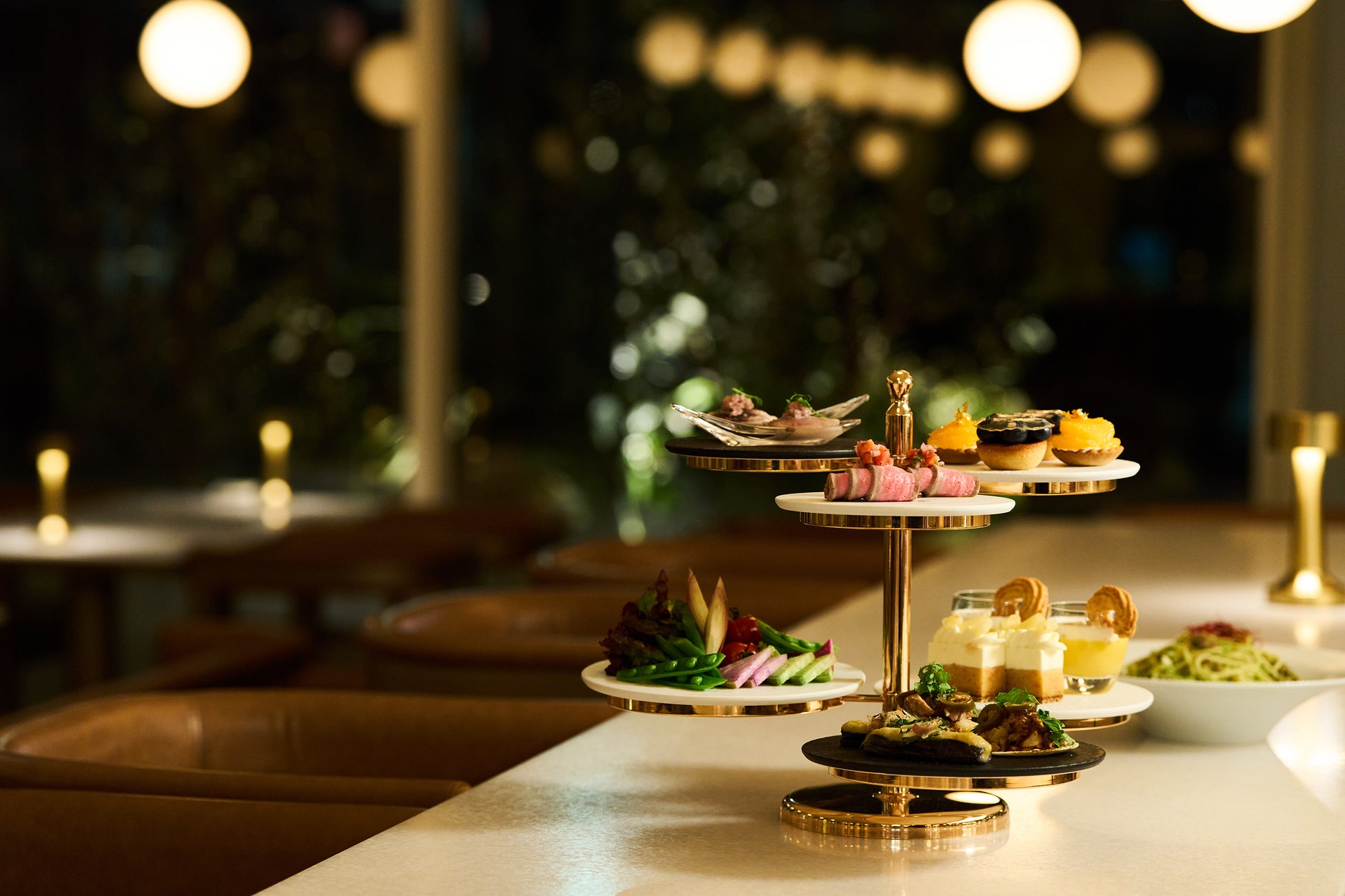 この度、1階『DEK KITCHEN』に、ディナータイム限定のイブニングハイティーが新登場。ピンクゴールドに煌めく6段のスタンドを彩るのは、 旬の国産野菜やフルーツを贅沢に使用したセイボリーやスイーツの数々。
