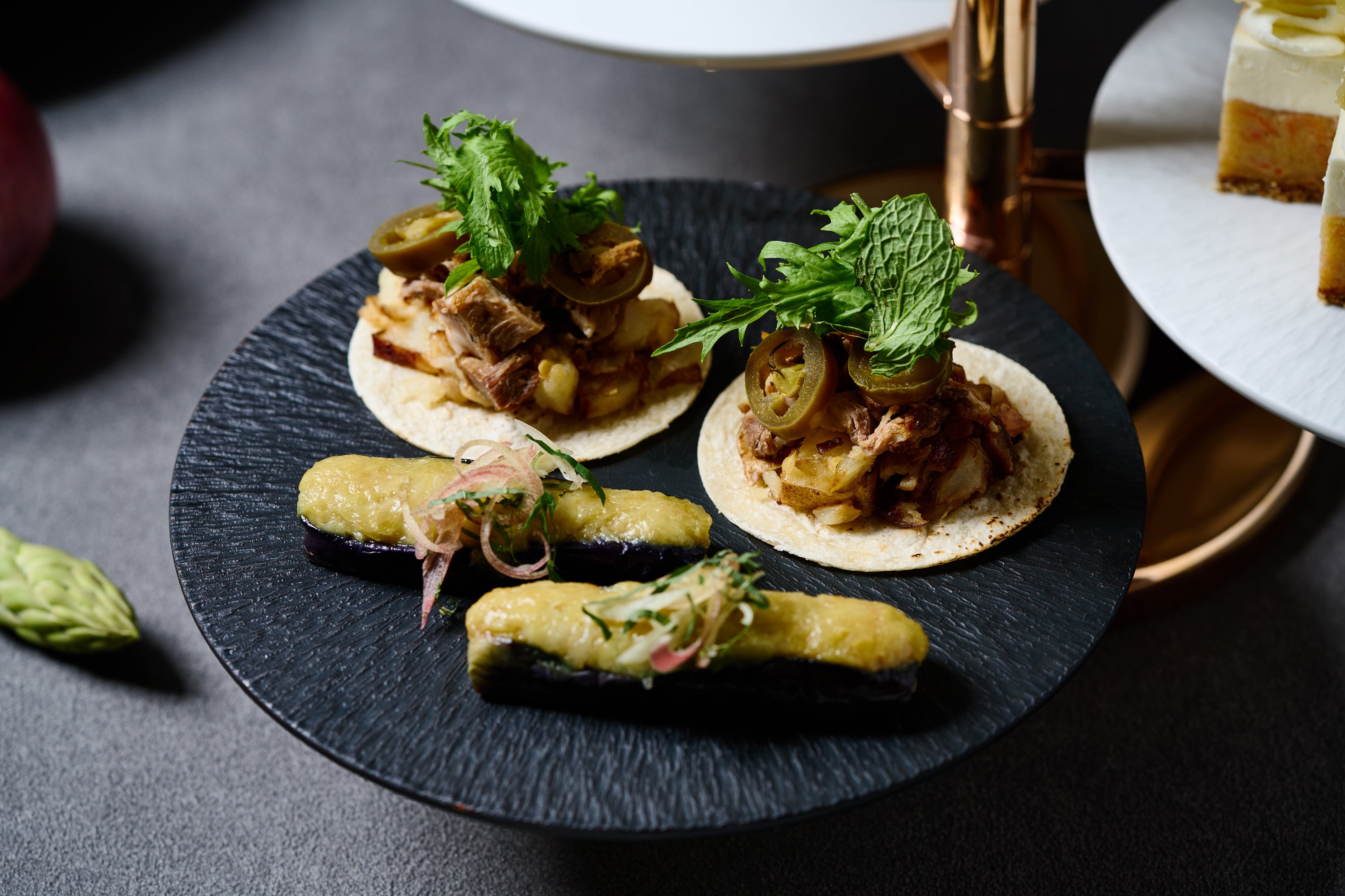 マッシュポテトやマデラ酒でじっくり煮込んだ豚肉、にんにくマヨネーズがコク深い、オープンタコス。