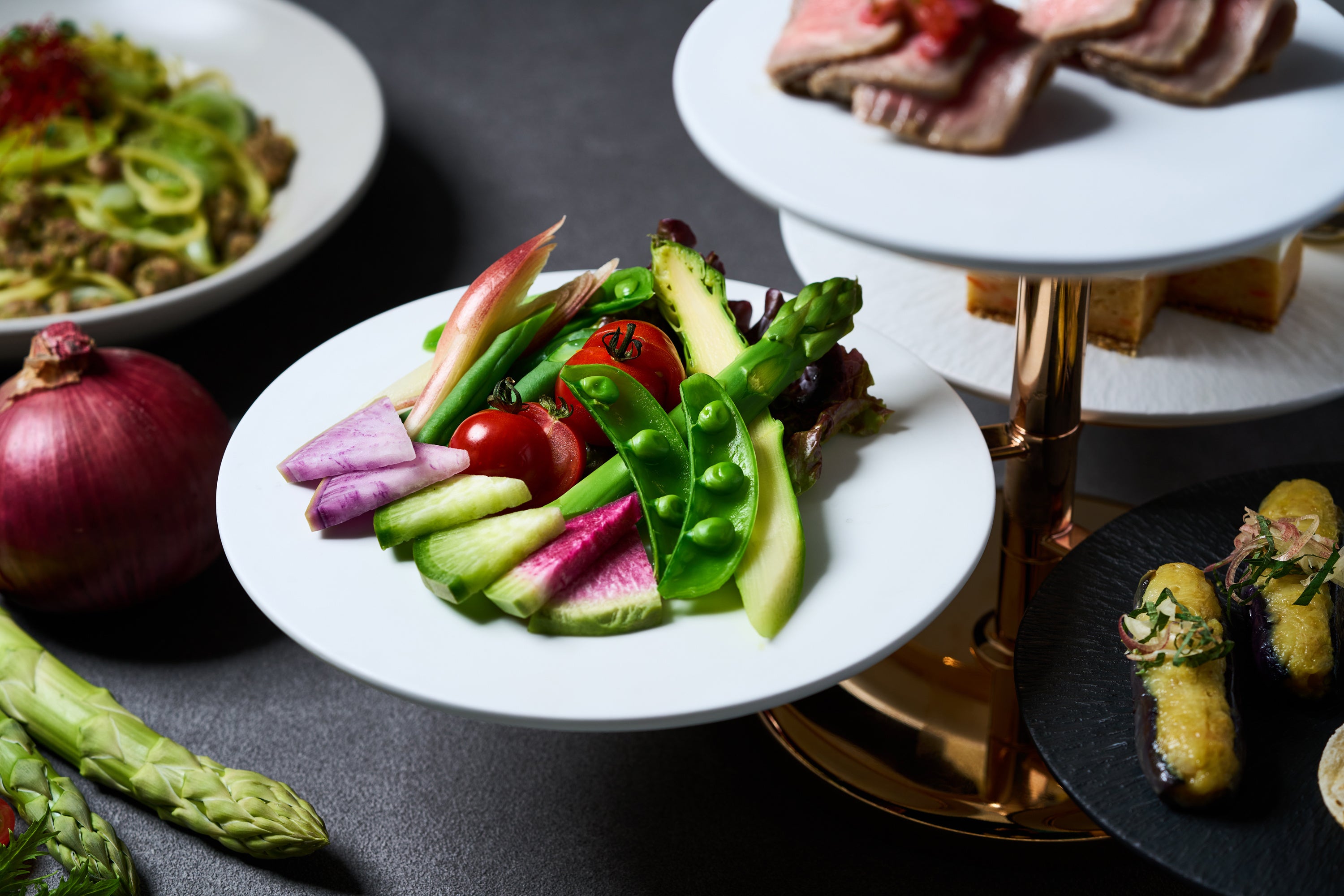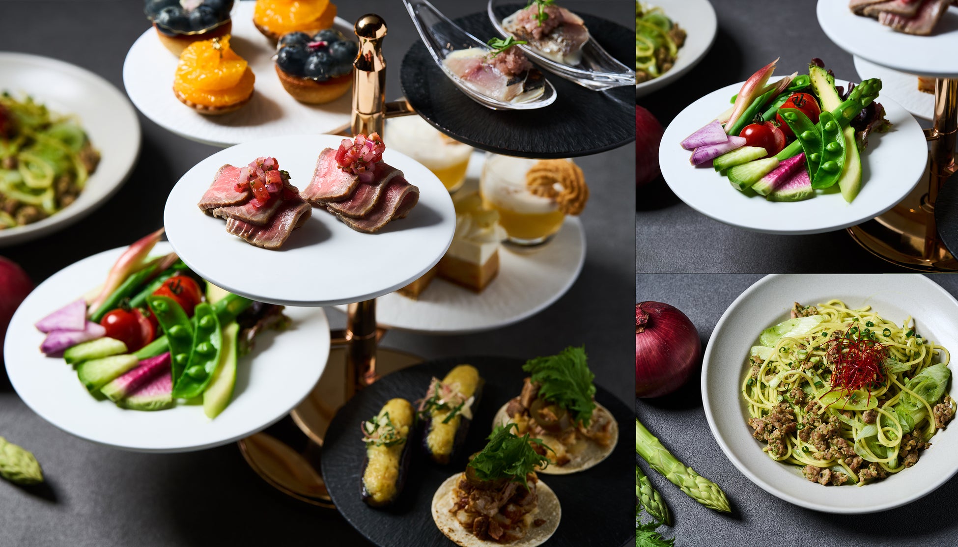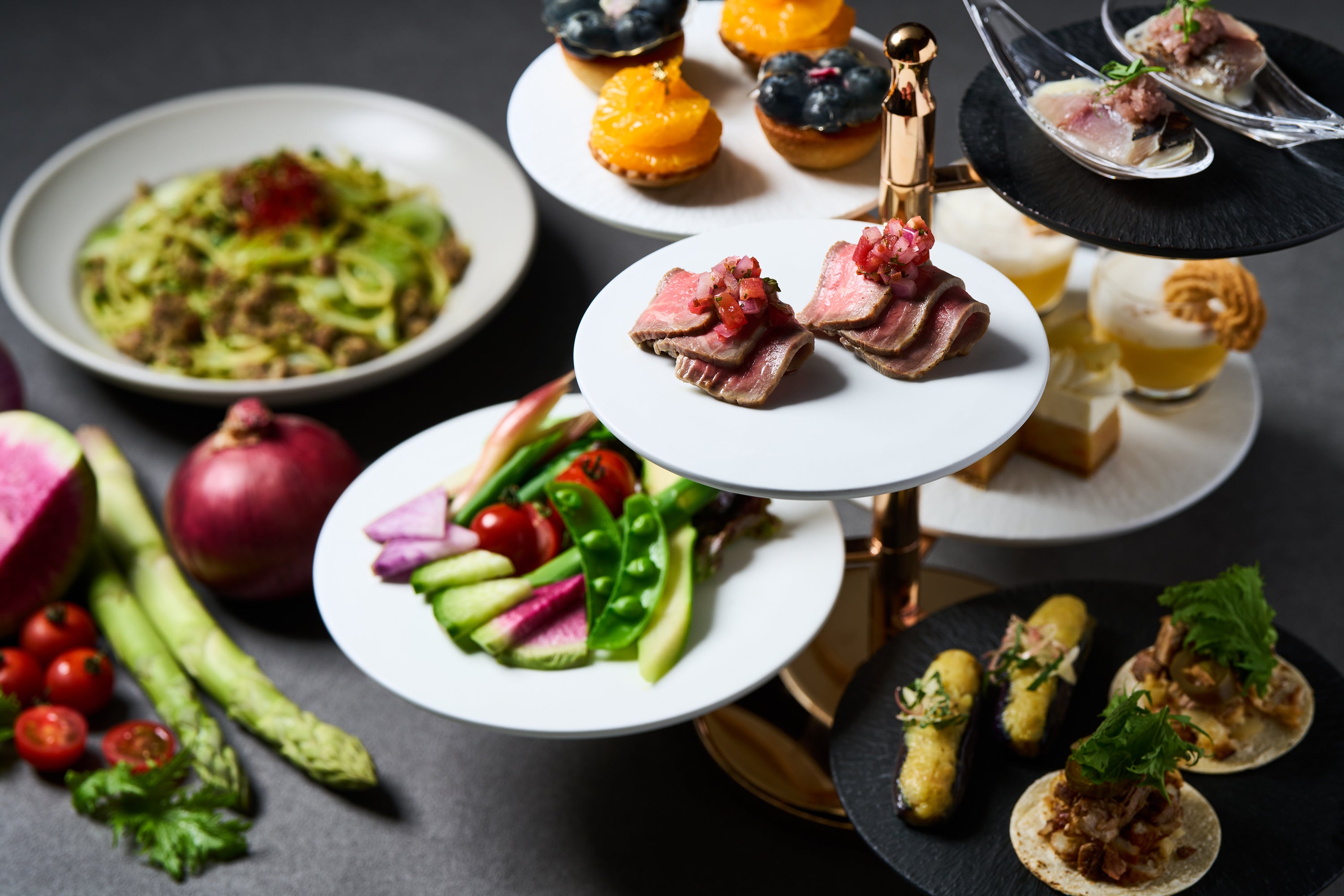 初夏の国産野菜&フルーツが彩るティースタンドに、季節野菜のパスタも