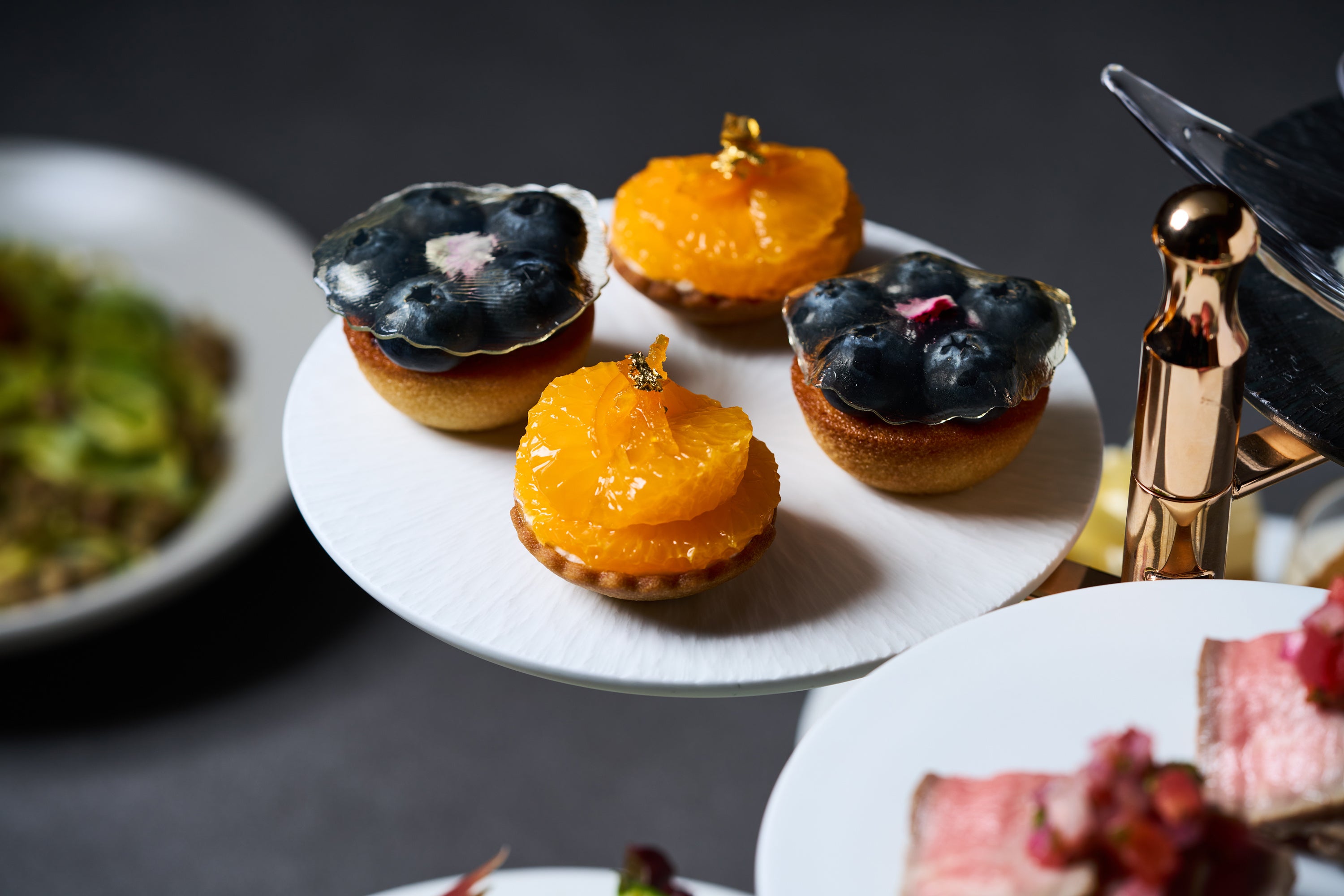 カスタードクリームと生クリームを詰めたフィナンシェタルトに、フレッシュな旬の柑橘と自家製マーマレードを合わせました。