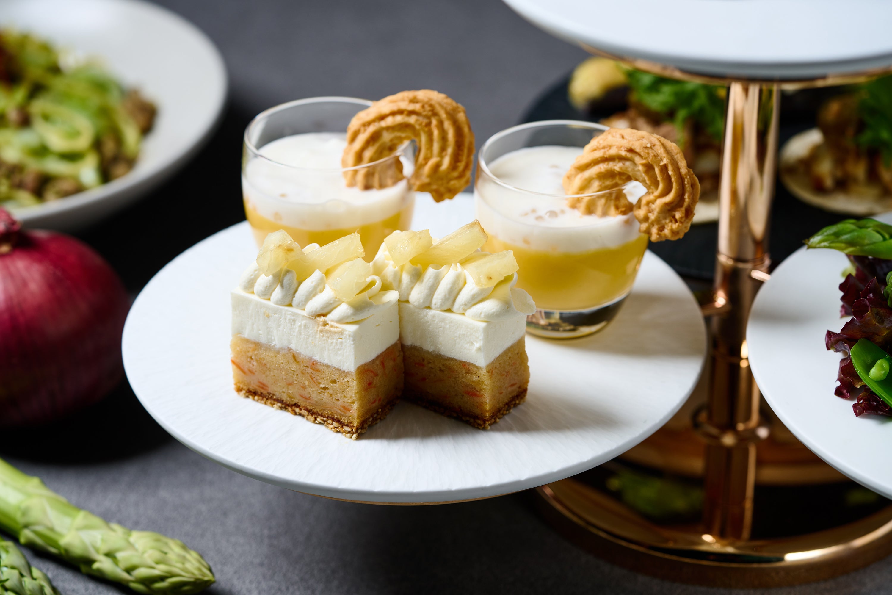 人参のやさしい甘みを生かしたキャロットケーキに、さっぱりとしたパイナップルのジュレと、まろやかなマスカルポーネムース、フレッシュなパイナップルを重ねました。
