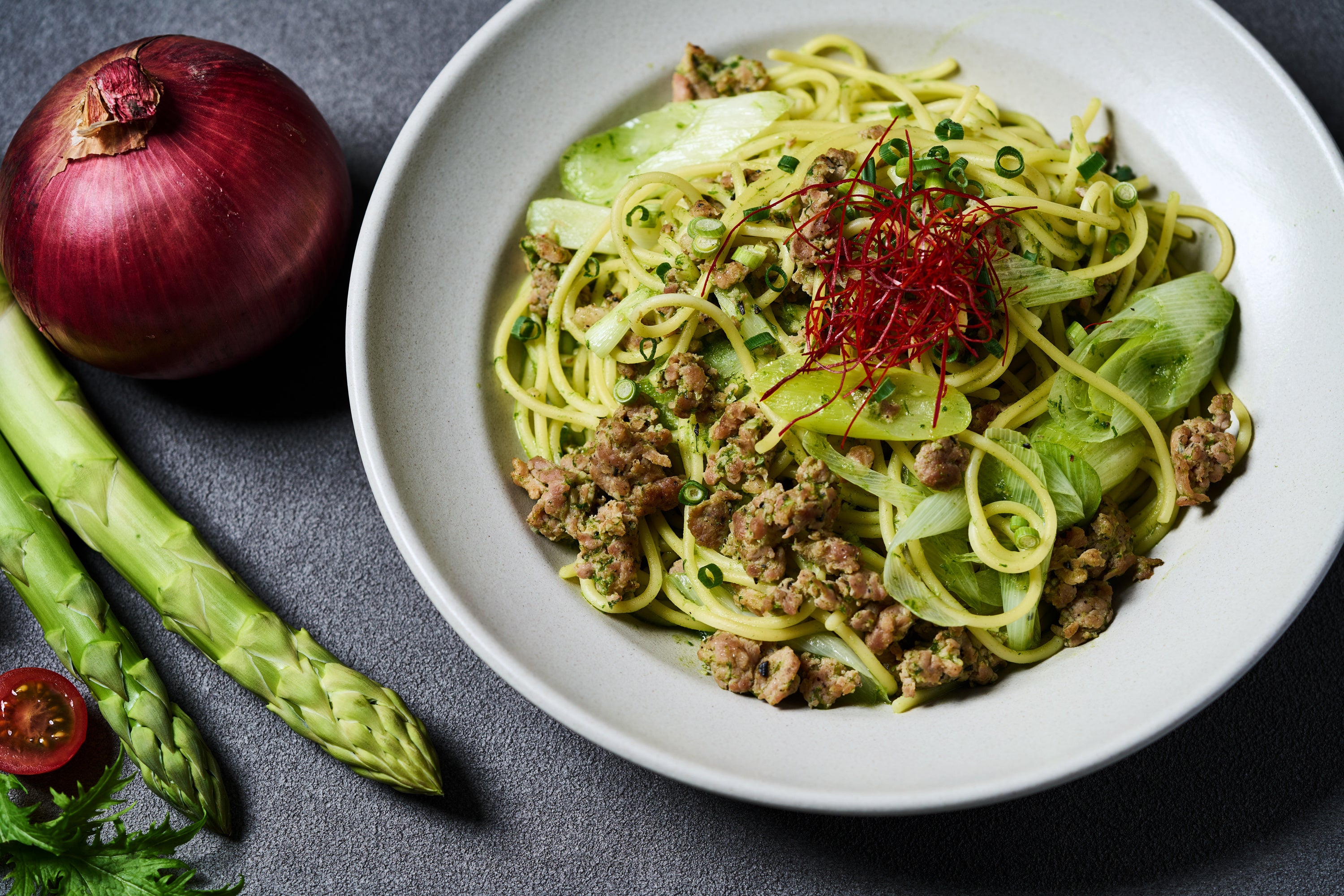 ラズベリービネガーに漬けたエシャロットと中東系のスパイスを添えて、さっぱりとした酸味とエスニックな味わいをプラスしました。