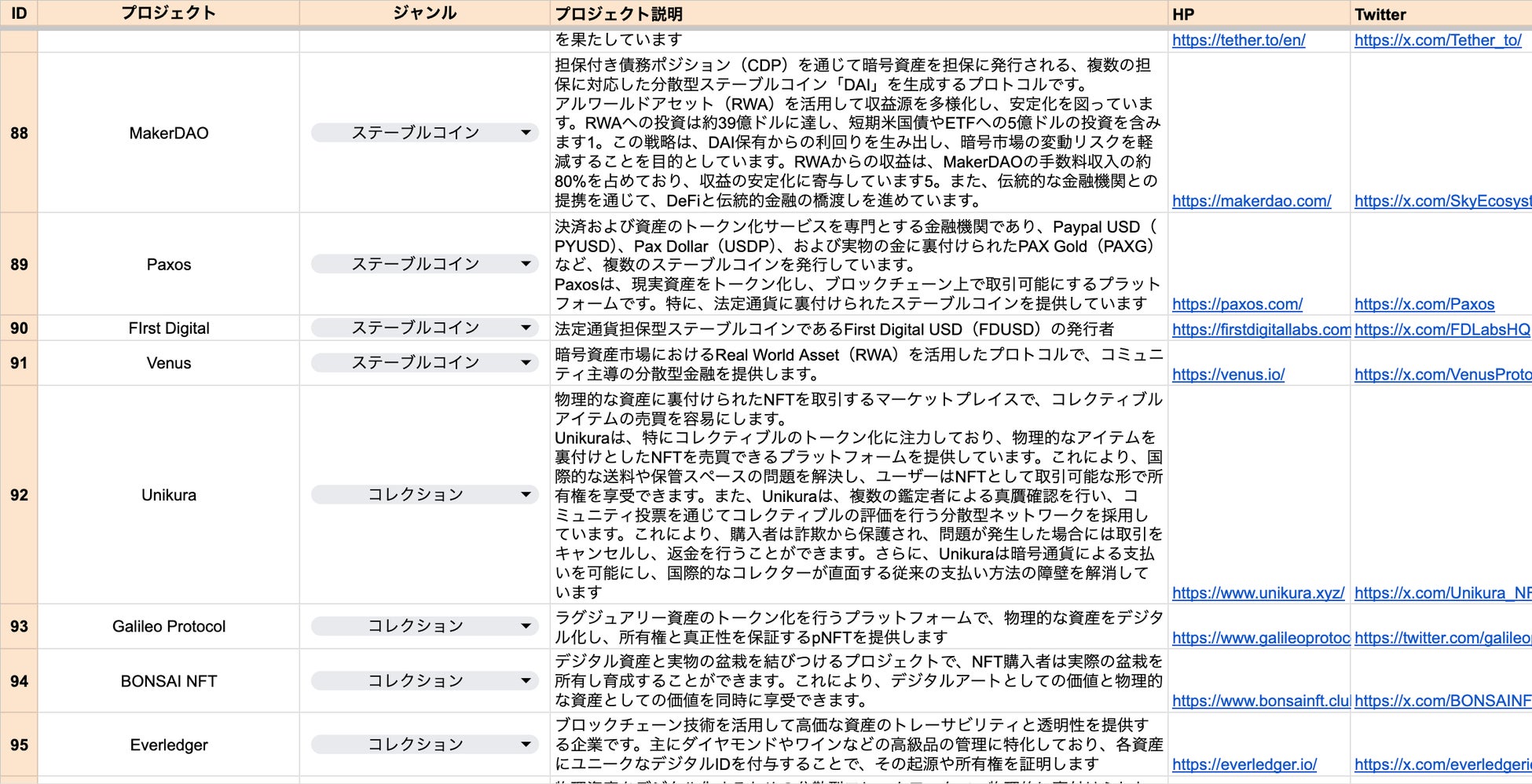「Real World Assetカオスマップ」は、ブロックチェーン/Web3を用いて現物資産をトークン化する「RWA」領域のプロジェクト等を19のカテゴリーに分類し、120個掲載しております。