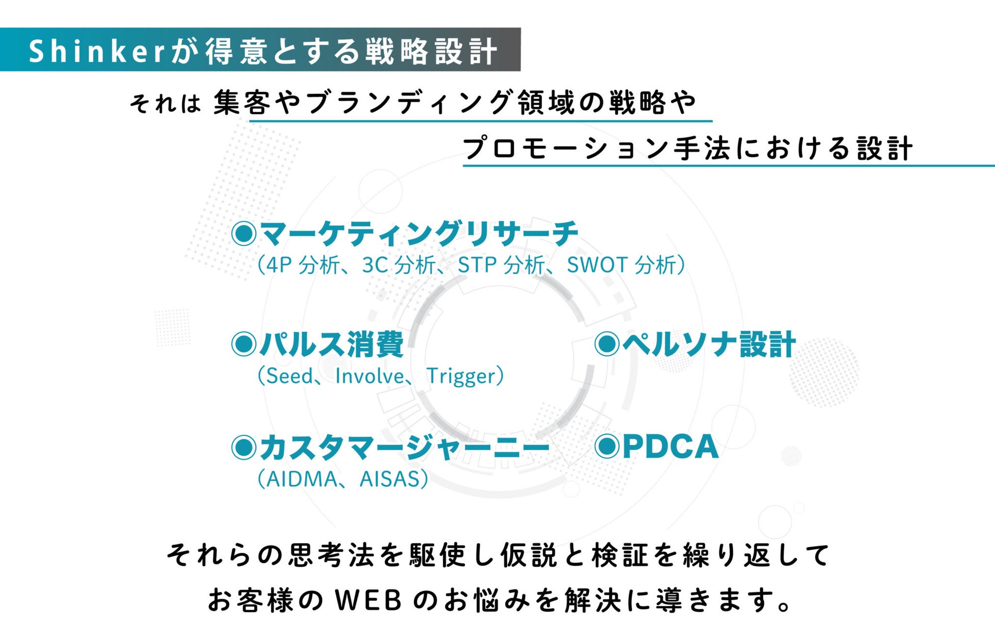 また、Shinkerは、ペルソナ設計を通じて、企業のサービスに最も関心を持つ顧客層を明確化し、どのような価値を提供すればよいかを細かく分析します。このアプローチにより、マーケティング施策の効果を最大化し、ターゲットに響くメッセージを届けることができます。