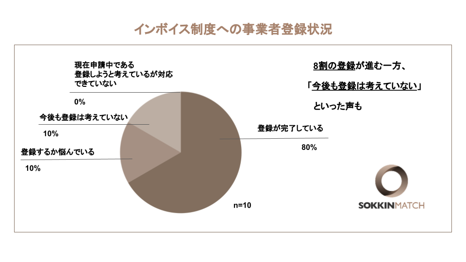 法人の登録状況は8月末時点でおよそ90%といわれるなか、個人事業主の登録状況はどうなっているのでしょうか。多くの個人事業主の方にご登録いただいている「SOKKIN MATCH」の事務局が、インボイス制度への対応状況を調査しました。