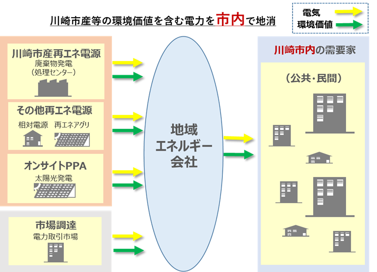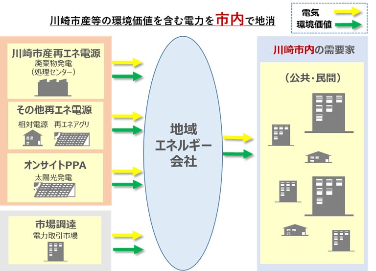 「川崎未来エナジー株式会社」は、川崎市の廃棄物発電の余剰電力および川崎市域内外の再生可能エネルギー電力を、公共施設や市内民間施設へ供給し、再生可能エネルギーの地産地消及び川崎市域の温室効果ガス排出量の削減を図り、さらに市民、事業者、金融機関等の多様なステークホルダーが参加できる地域エネルギープラットフォームを構築。