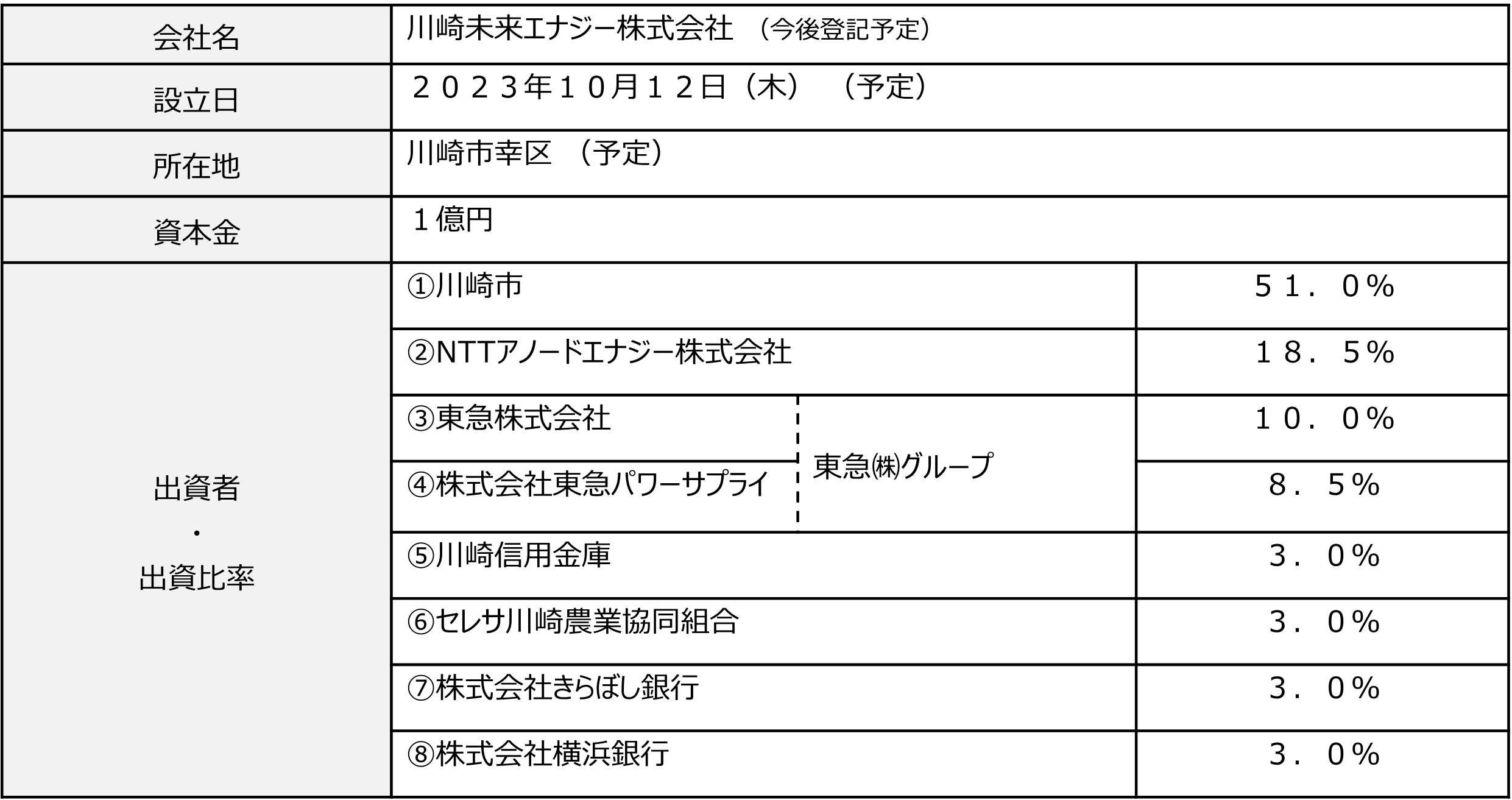 本日、川崎市と東急株式会社、株式会社東急パワーサプライ、川崎信用金庫、セレサ川崎農業協同組合、株式会社きらぼし銀行、株式会社横浜銀行とともに、地域エネルギー会社の設立発起人会を実施し、今年10月に「川崎未来エナジー株式会社」を設立することに合意しました。