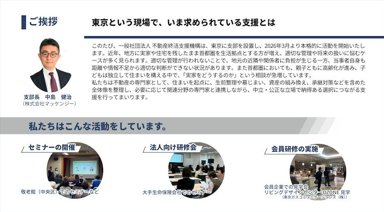 東京支部の発足は、不動産終活を“概念”から“現場で活きる取り組み”へと進める大きな一歩となります。
