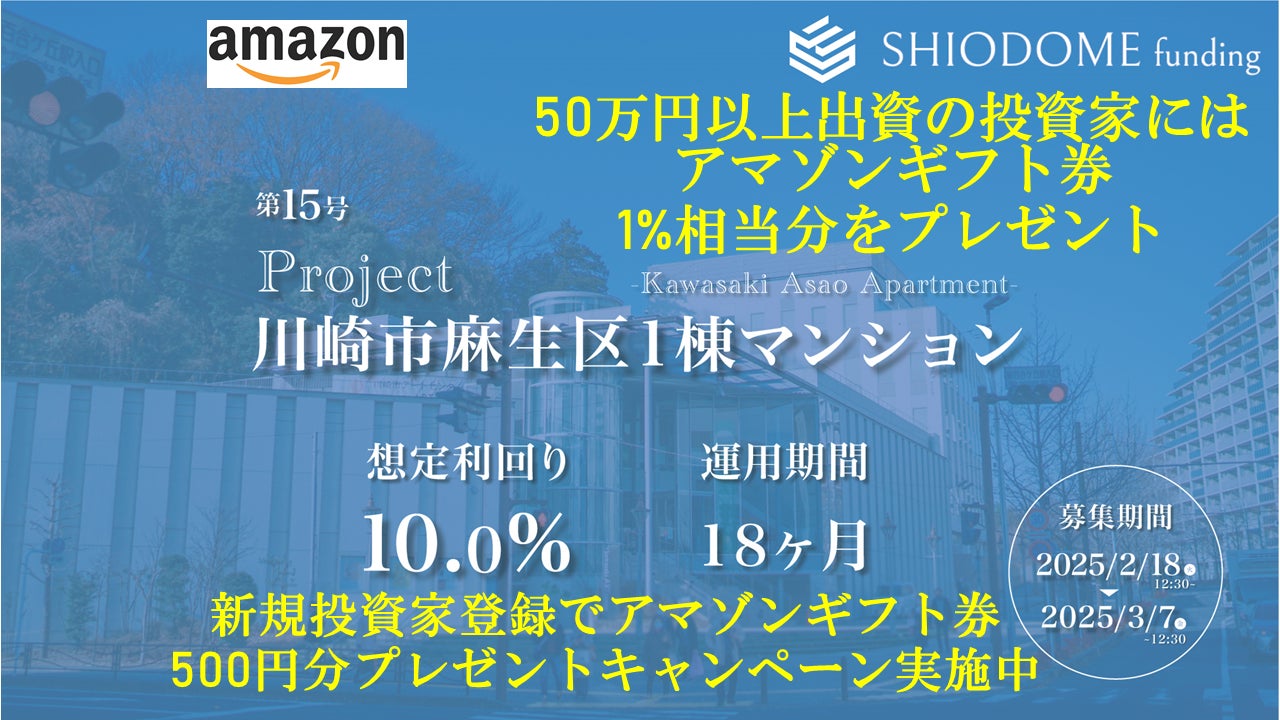 「汐留funding」投資家登録アマゾンギフト券プレゼントキャンペーン実施中の第15号ファンドの募集概要を公開
