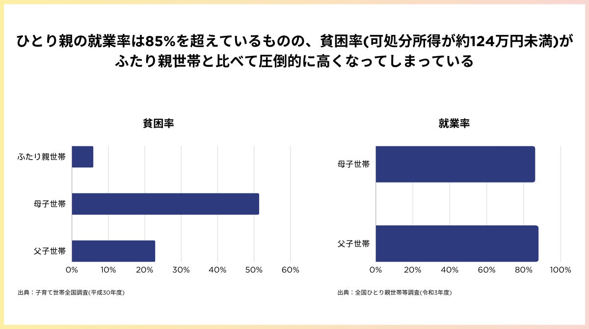 ひとり親の方の就業率は85%を超えているものの、貧困率(可処分所得が約124万円未満)がふたり親世帯と比べて圧倒的に高くなってしまっています。