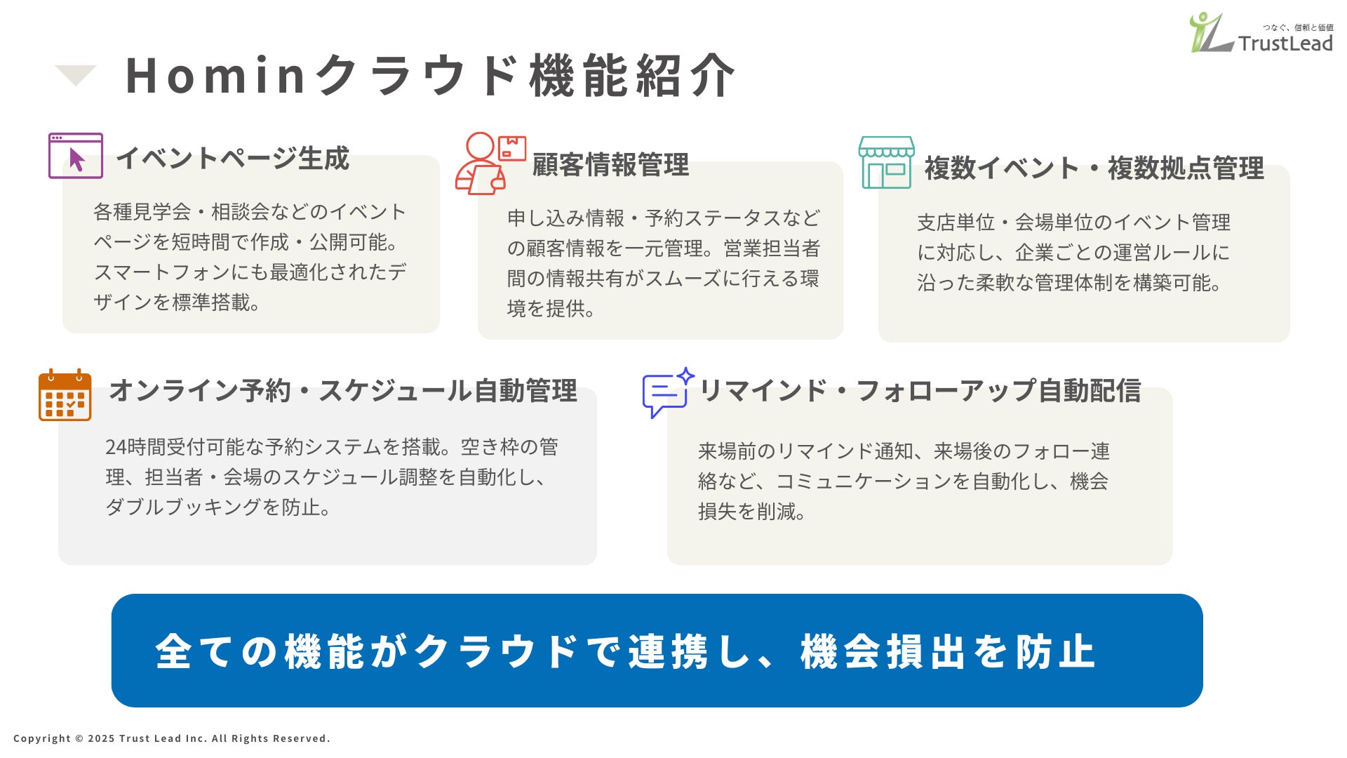 Trust Leadは、住宅会社が抱える集客・運営・追客の課題における工数削減と営業成果を支援するため、「Hominクラウド」をHominサービス郡の重要な機能として提供します。今後も、住宅会社向け集客プラットフォーム「Homin」とのデータ連携をさらに強化し、“集客から成約まで” を一貫して支援する住宅会社のパートナーとして、サービス全体の拡張と機能開発を進めてまいります。