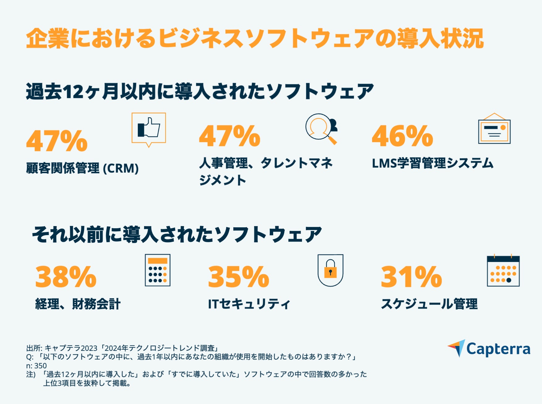 次に、同調査内で2024年の主要な課題について質問したところ、「有能な人材の確保」(30%)、「従業員のスキルアップやトレーニング」(29%)、「新規顧客や取引先の獲得」(29%)という回答があがり、企業がこれら課題に対応するためCRMや人事管理、LMS製品を導入していることが窺えます。