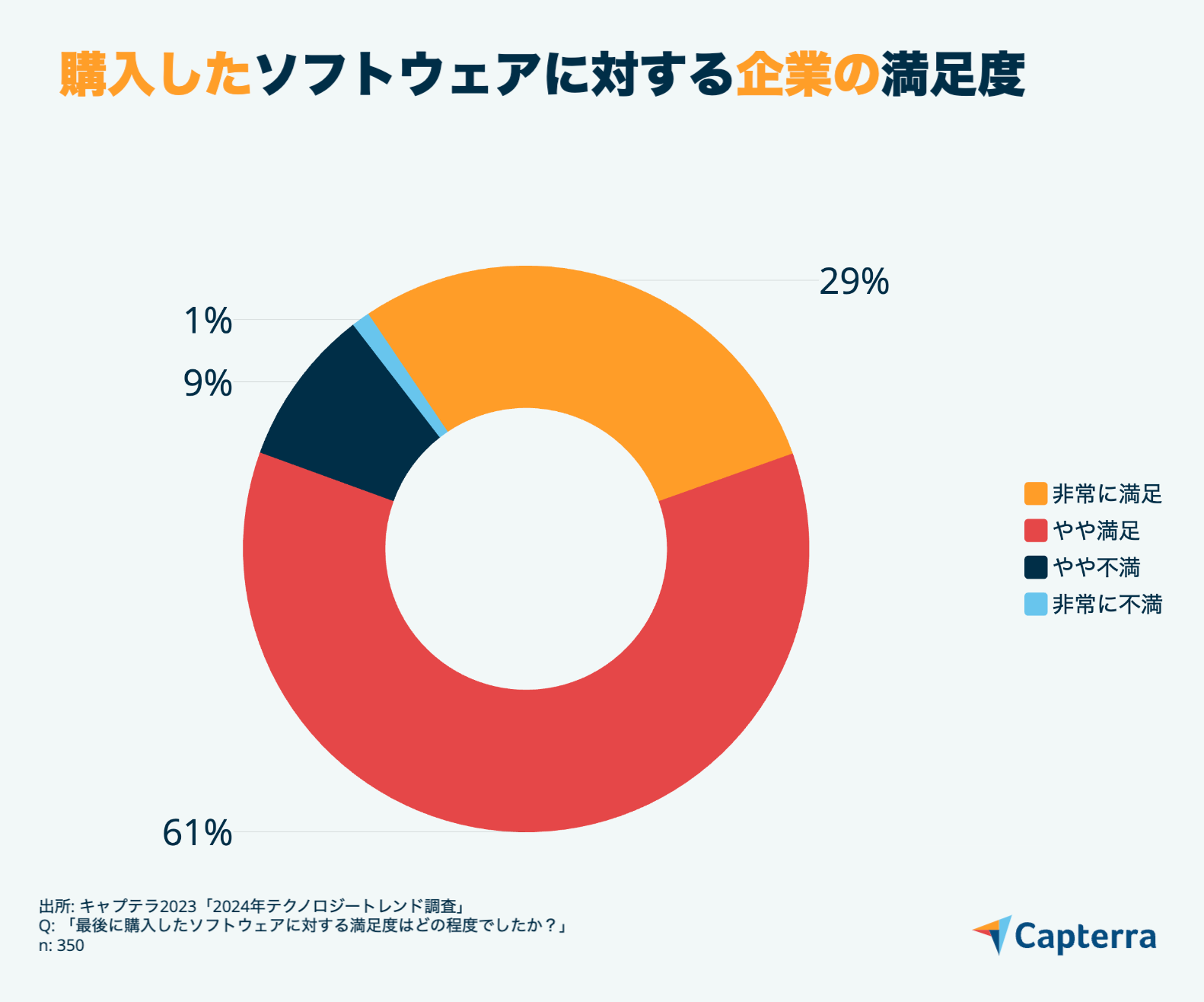 最後に購入したソフトウェアに対する満足度を企業に尋ねたところ、9割の回答者が満足(やや満足:61%、非常に満足:29%)と満足度が非常に高いことがわかりました。
