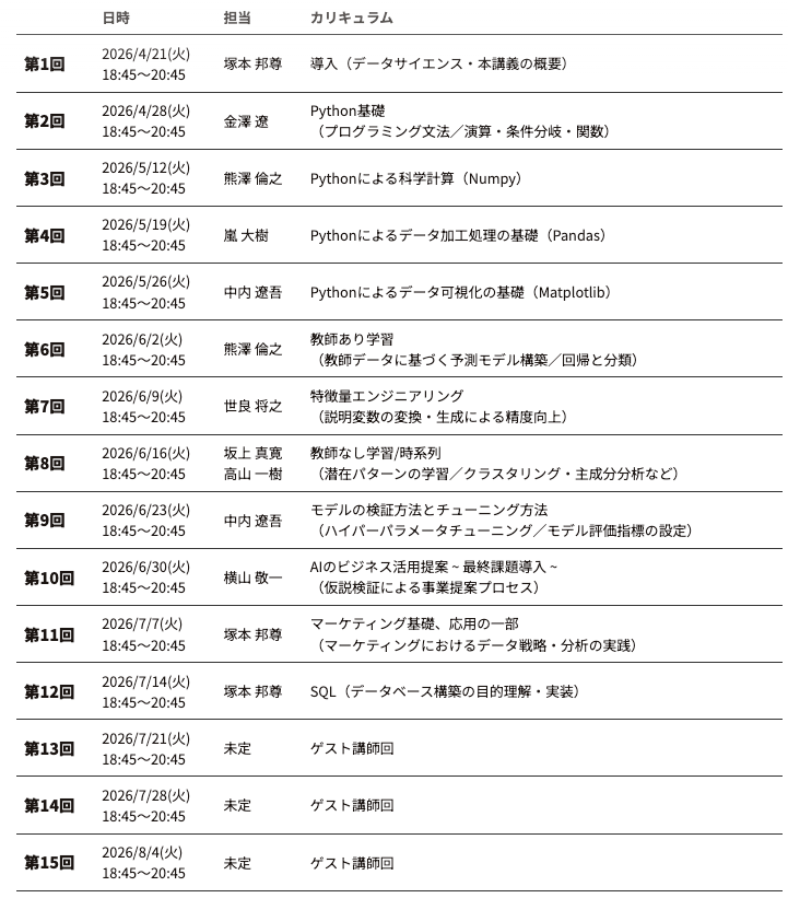 本講座では、Pythonプログラミングの基礎に始まり、データ加工・可視化、教師あり学習・教師なし学習などの機械学習手法、SQLによるデータベース操作、そしてAIのビジネス活用提案までを全15回で体系的に学びます。Kaggle形式のデータ分析コンペティションへの参加や最終課題演習を通じて、実務レベルで活用できる力を身につけられる設計となっています。